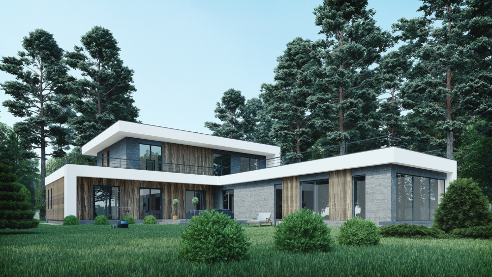 Современный и просторный двухэтажный коттедж, выполненный в минималистичном стиле с контрастной и текстурной отделкой. Фасады сочетают белую штукатурку, облицовку под тёмный камень и вертикальные деревянные ламели, добавляющие естественности. Дом имеет панорамное остекление и плоскую крышу с металлическим ограждением, которая используется как терраса. На первом этаже расположен гараж на 2 машины.