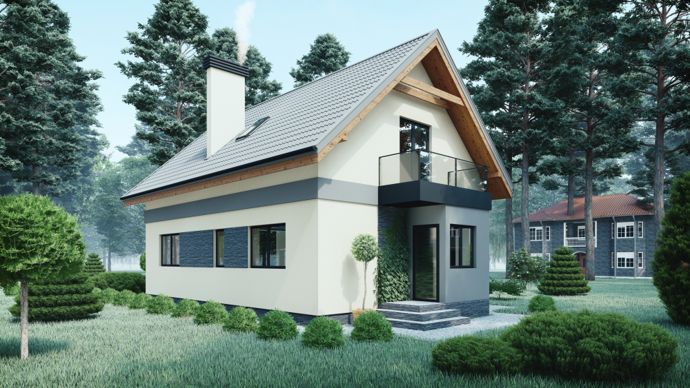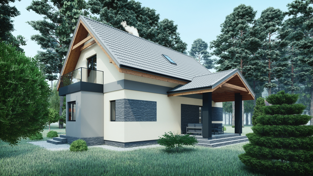 Двухэтажный дом с мансардой. Фасады отделаны в светлой штукатурке с декоративными вставками из темного камня и горизонтальными серыми акцентами. Крыша — четырехскатная, покрытая металлочерепицей серого цвета, с выступающими деревянными стропилами. Изюминка проекта – уютная крытая терраса с выходом в сад и балкон на втором этаже, что придает дому современности и функциональности. Большие окна обеспечивают максимальное естественное освещение.