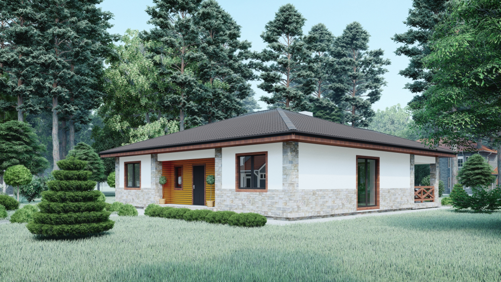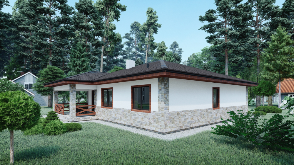 Современный одноэтажный дом, сочетающий в себе лаконичность и функциональность. Фасады отделаны светлой штукатуркой в комбинации с декоративным камнем, что придает зданию элегантный вид. Деревянные элементы добавляют тепло и уют. Четырехскатная крыша покрыта темной металлочерепицей, что создает приятный контраст. Главным акцентом является просторная крытая терраса с деревянным забором, идеально подходящим для обустройства летней столовой или зоны отдыха на свежем воздухе.