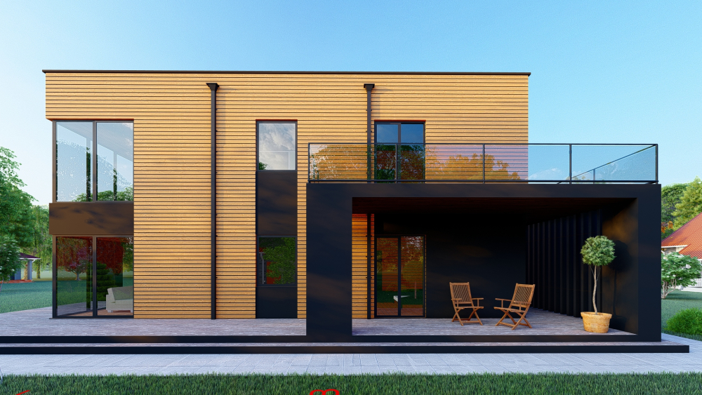 Современный двухэтажный коттедж с плоской крышей, сочетающий минималистичный дизайн и натуральные материалы. Фасады выполнены из деревянных панелей светлого оттенка, которые контрастируют с темными графитовыми элементами. Дом имеет большие панорамные окна, обеспечивающие максимальное освещение и открывающие прекрасные виды. На втором этаже расположен балкон со стеклянными ограждениями. На первом этаже предусмотрена просторная крытая терраса с деревянными ламелями, которые создают уютную тень, где можно организовать летнюю столовую или зону для отдыха.