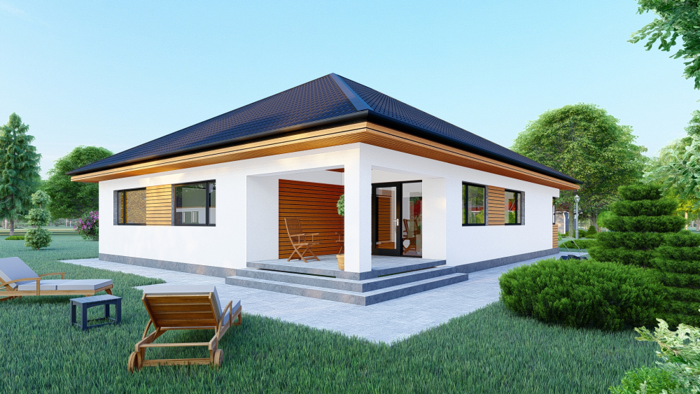 Современный одноэтажный дом с четкой геометрией объемов. Фасады украшены в светлых тонах с акцентами под натуральное дерево. Большие панорамные окна открывают простор для естественного освещения. Архитектура предусматривает гараж на 2 авто, интегрированный в общий объем дома, а также просторную террасу с выходом во двор. Снаружи дом выглядит сдержанно и функционально, ориентированный на комфортную жизнь одной семьи.