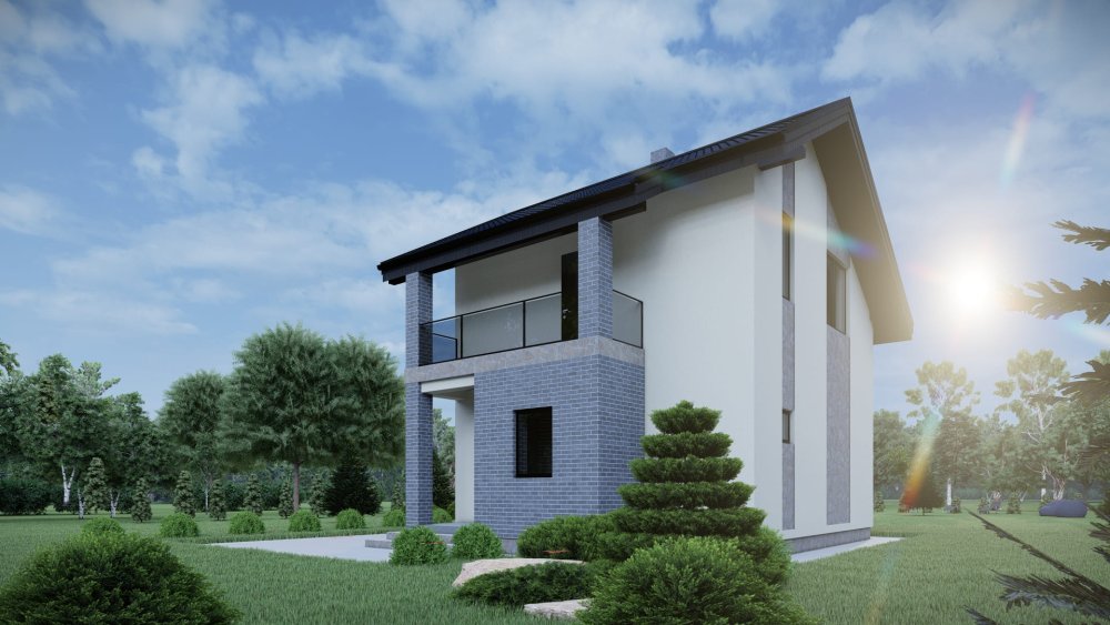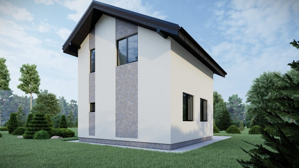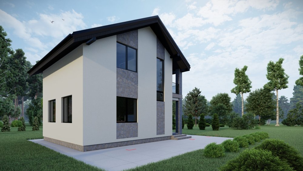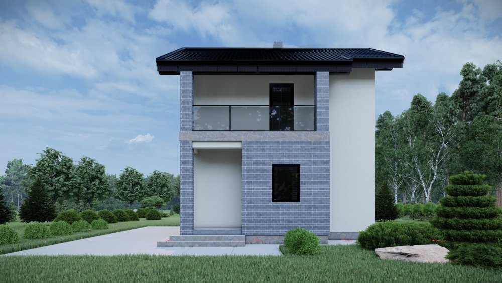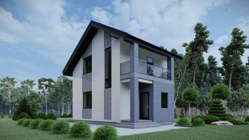 Компактный двухэтажный дом, в классическом стиле с простой двускатной крышей и выразительными вертикальными вставками из декоративного камня на фасаде. Несмотря на малую площадь, планировка функциональна: первый этаж вмещает общую зону кухни-гостиной и санузел, а второй этаж — две спальни и дополнительную ванную комнату. Дом оснащен балконом, который служит крышей для входной группы.