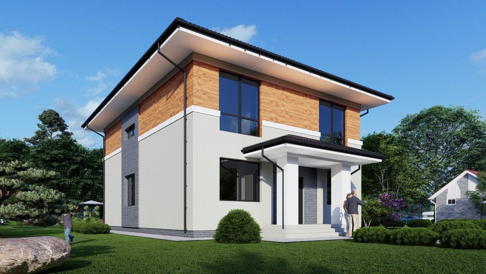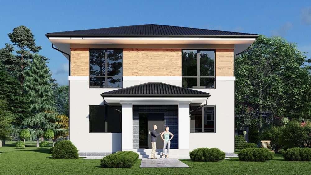 Современный двухэтажный дом в классическом стиле с четырехскатной крышей. Фасад имеет выразительный дизайн благодаря контрастной отделке: первый этаж выполнен с использованием темного клинкерного кирпича, а второй — из светлой штукатурки с деревянными акцентами под крышей.