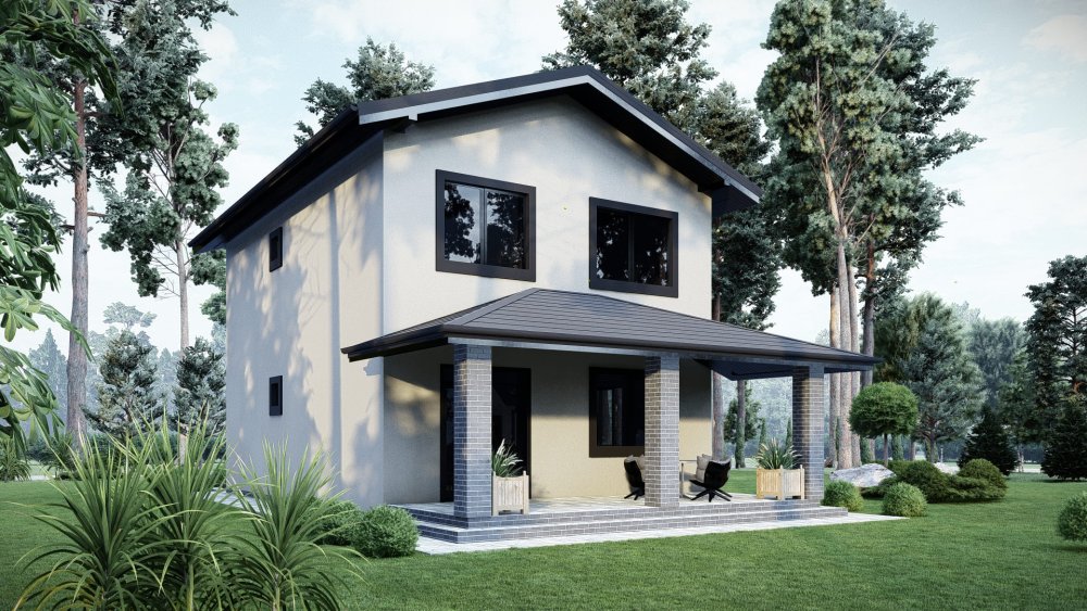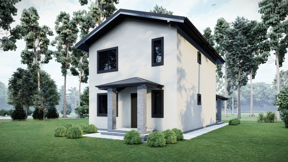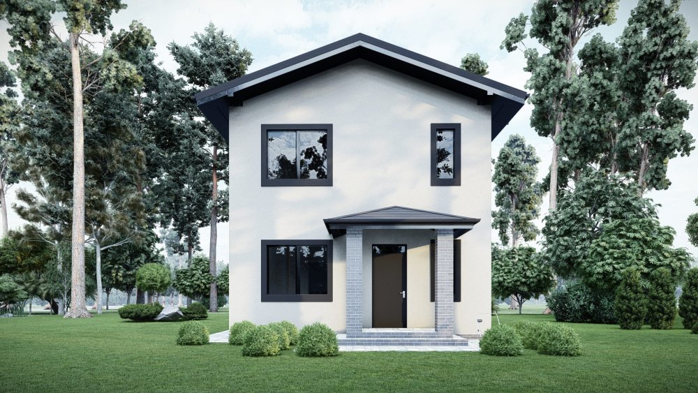 Компактный и функциональный двухэтажный дом с классической двускатной крышей. Фасад отделан светлой штукатуркой с акцентными вставками из серого декоративного кирпича на углах и входной группе, что придает зданию современный вид.
