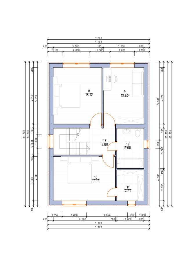 • Узлы - разрезы по стенам, устройство перемычки, коньковый гребень, примыкание к дымовой трубе, подшивка кровли, устройство деревянной обшивки, армирование террасы, опирание перегородок на плиту пола 1-го этажа, опирание внешней стены на фундамент.