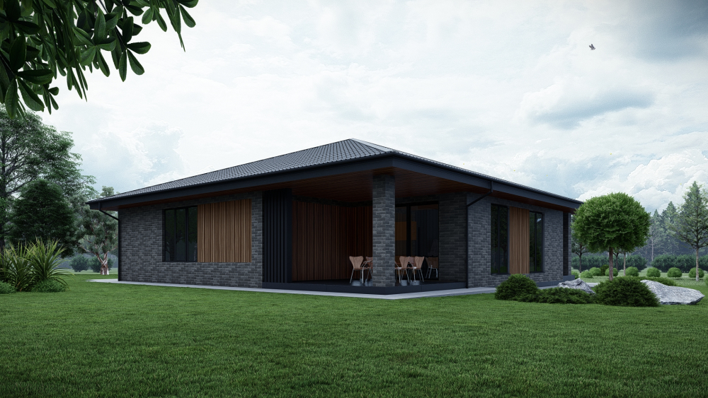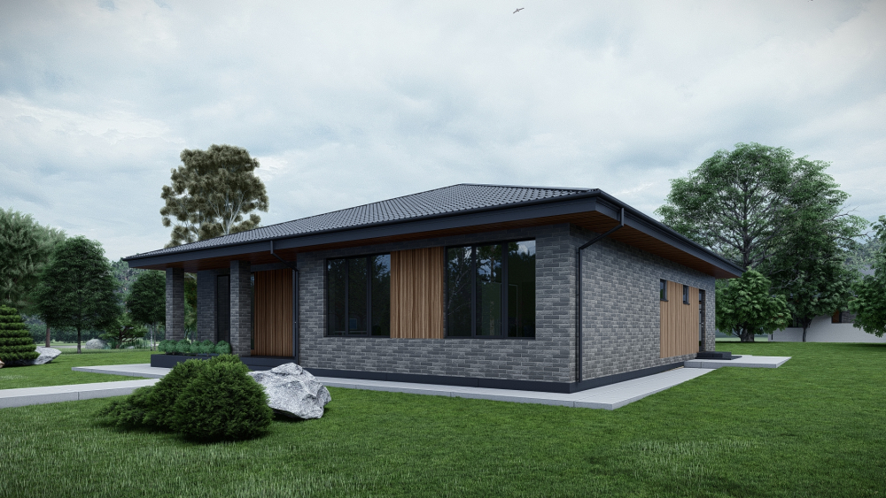 Просторный одноэтажный дом с четырехскатной крышей, выполненный в современном стиле. Фасад отделан темным клинкерным кирпичом с декоративными вставками из деревянных реек, что придает зданию стильный и респектабельный вид. Планировка отличается высокой функциональностью.