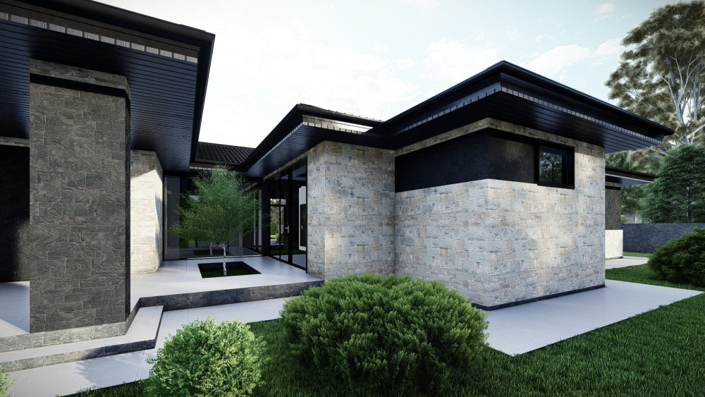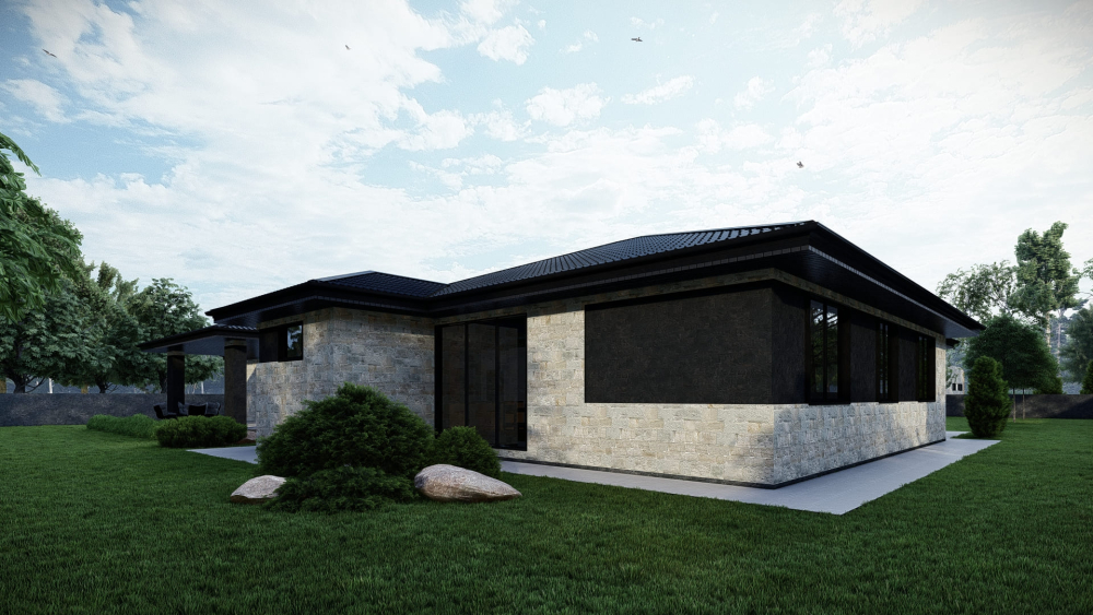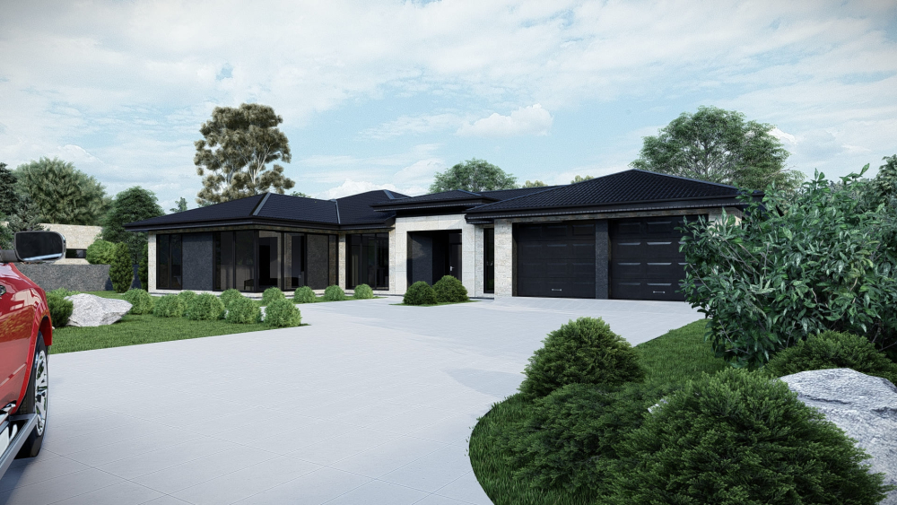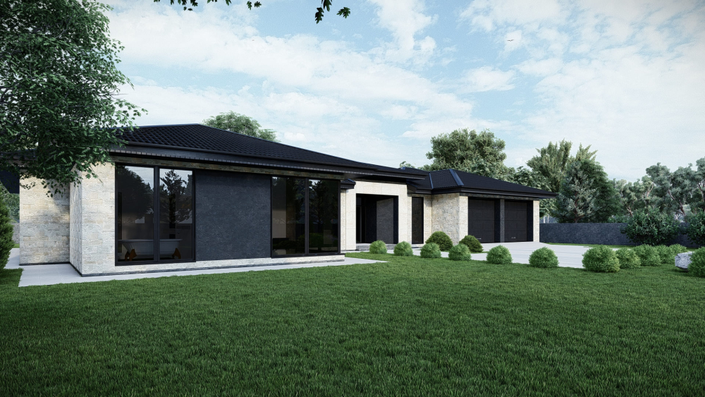 Роскошная одноэтажная резиденция в стиле хай-тек с плоской крышей, поражающая своими масштабами и продуманной планировкой. Фасад выполнен в современном стиле с использованием контрастных цветов и панорамного остекления. Центральным элементом интерьера является грандиозное открытое пространство гостиной-кухни площадью почти 94 м². Дом имеет три спальни, одна из которых представляет собой отдельный блок (мастер-спальню) с собственной большой ванной комнатой и двумя гардеробными. Также предусмотрен огромный гараж на два авто и многочисленные подсобные помещения.