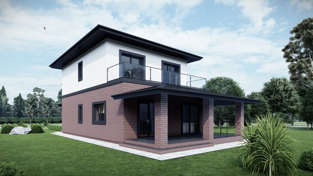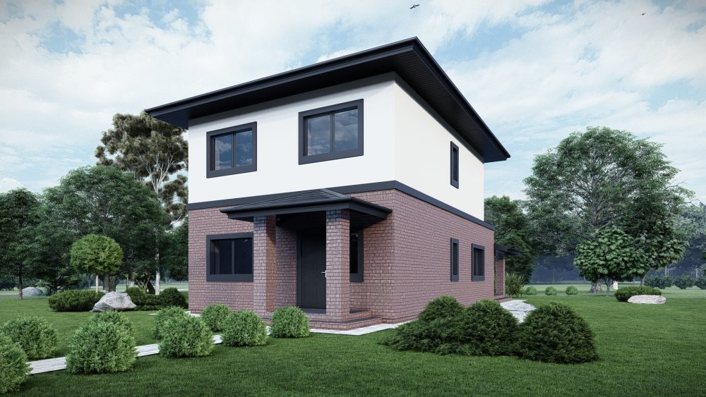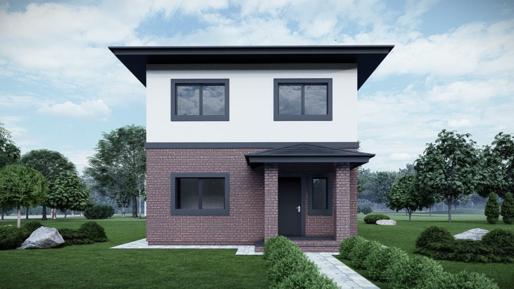 Компактный двухэтажный дом с классической четырехскатной крышей. Фасад имеет современный вид благодаря комбинации белой штукатурки и вставок из натурального дерева. Рациональная планировка позволила разместить на небольшой площади четыре полноценные спальни (одна на первом этаже, три на втором), просторную зону кухни-гостиной с выходом на террасу и необходимые технические помещения.