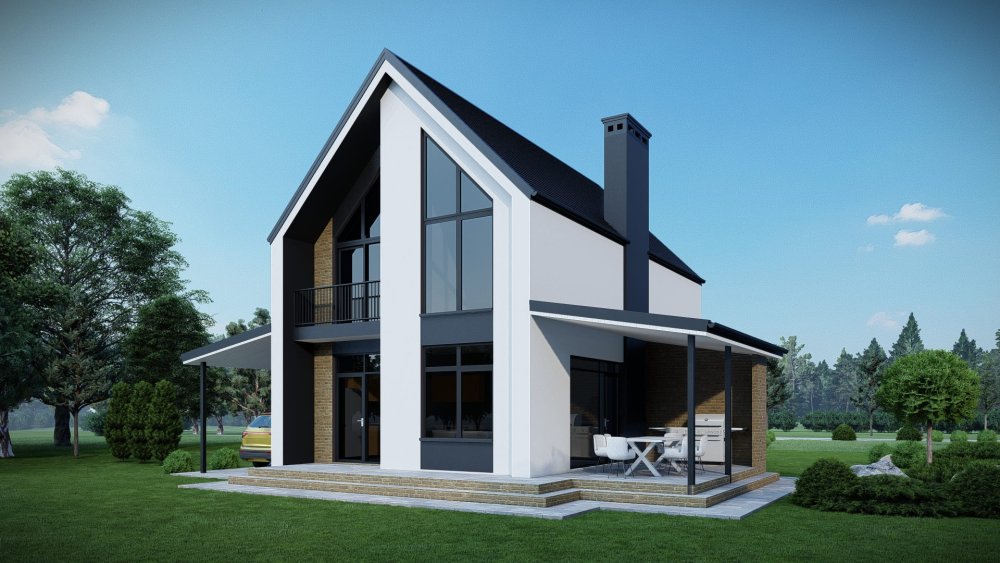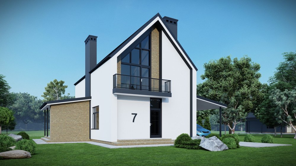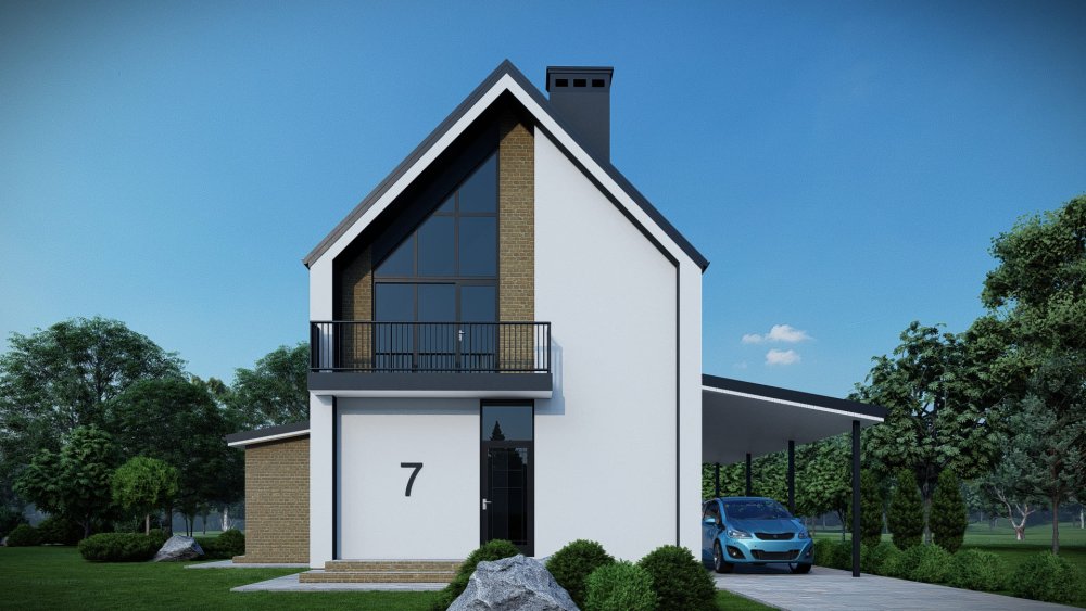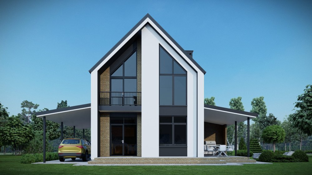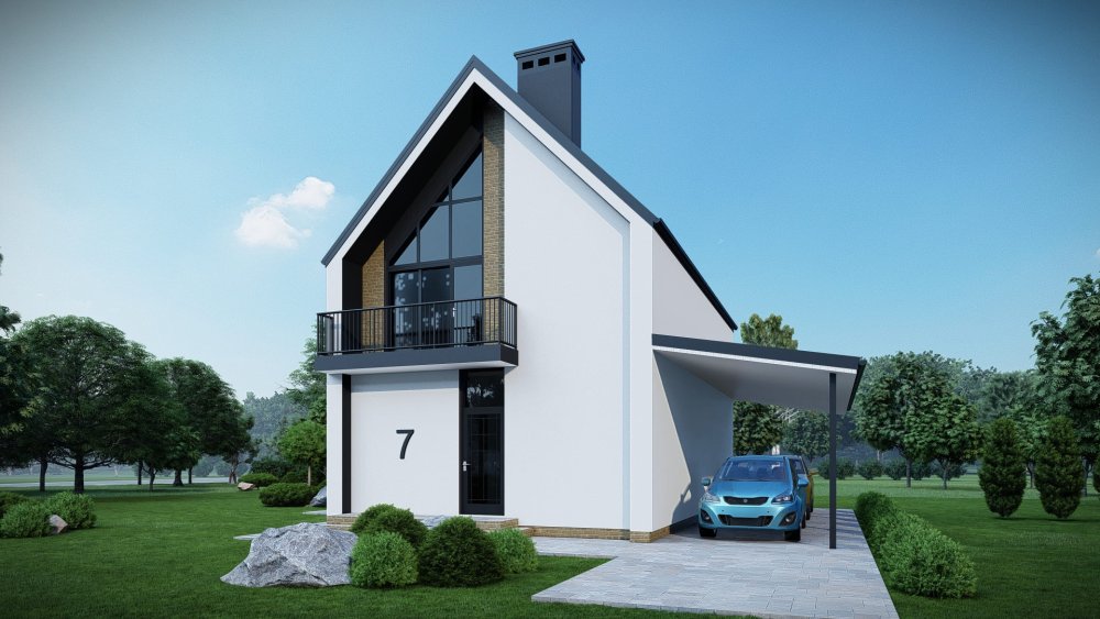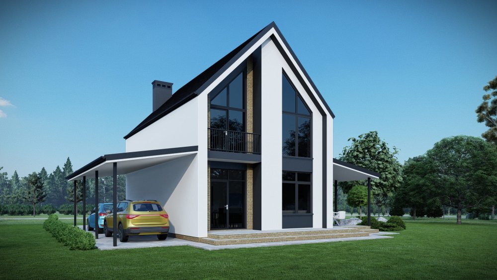 Компактный двухэтажный дом в современном стиле с двускатной крышей. Фасад отличается стильным сочетанием темной штукатурки, имитирующей графитовый цвет, с вертикальными вставками из светлого дерева. Это придает зданию выразительный и актуальный вид. Планировка разработана для максимальной функциональности на небольшой площади. Сбоку к дому примыкает навес для автомобиля.