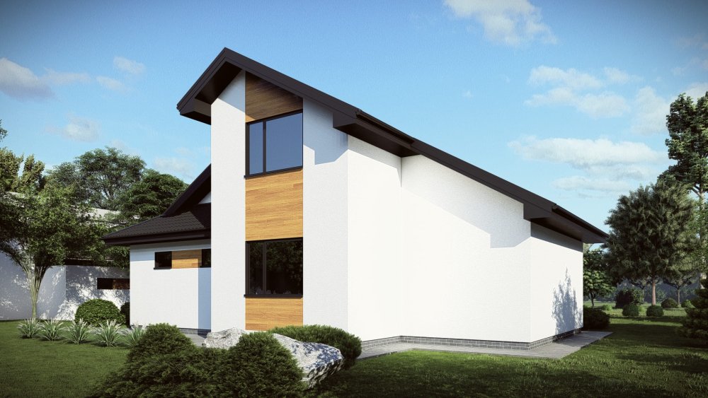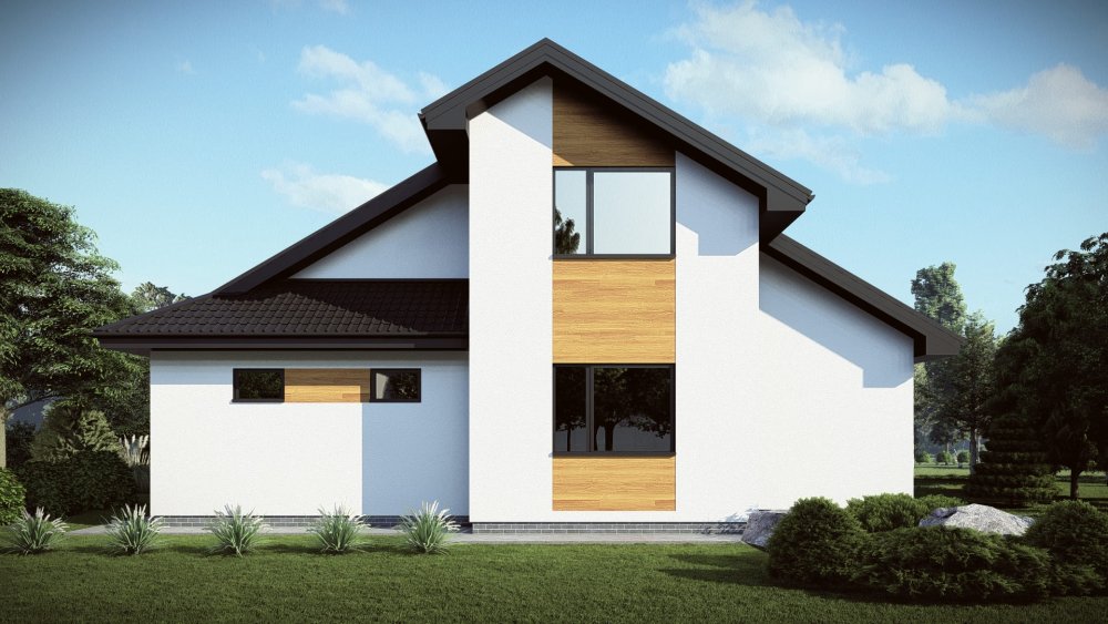 Современный двухэтажный дом в стиле барнхаус с высокой двускатной крышей без свесов. Фасад отличается выразительным контрастом светлой и темной штукатурки, дополненным вертикальным деревянным планкеном, подчеркивающим стремительность архитектурных линий. Панорамное остекление фронтона обеспечивает отличное освещение внутреннего пространства.
