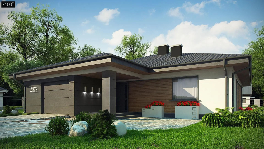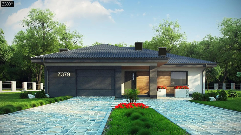 U379 v1 - современный одноэтажный дом с гаражом, созданный для комфортной жизни семьи из 3–5 человек. Это обновлённая версия популярного проекта с улучшенной планировкой, где каждый метр используется максимально эффективно.