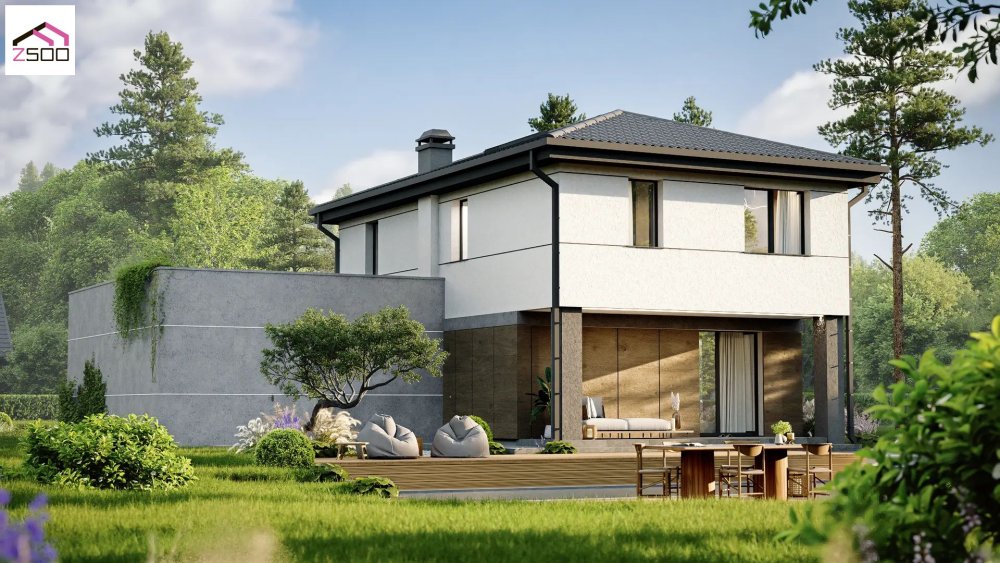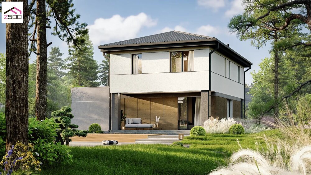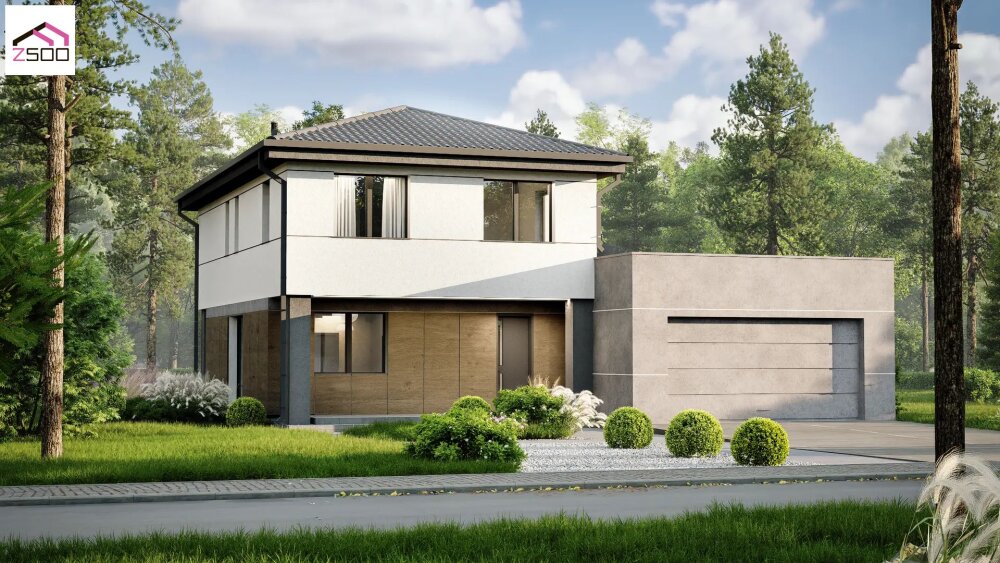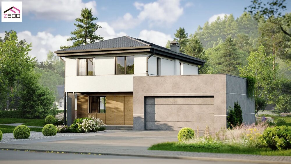 Проект двухэтажного дома для комфортной семейной жизни за городом. Архитектурная концепция здания построена на игре объемов, стильных контрастах и сочетании строгих геометрических форм с уютными природными текстурами. Светлая, лаконичная штукатурная отделка второго этажа гармонично дополняется теплыми фасадными панелями с имитацией дерева на первом уровне. Особым архитектурным акцентом выступает массивный пристроенный блок гаража с плоской крышей, выполненный в фактуре светло-серого архитектурного бетона, что добавляет экстерьеру легкого урбанистического шарма. Темная вальмовая крыша, графитовые оконные рамы и системы водоотведения четко очерчивают контуры здания и подчеркивают премиальность дизайна. Проект отличается высокой функциональностью: вместительный гараж органично интегрирован в общий ансамбль, а входная группа и фасадная часть первого этажа надежно защищены нависающим объемом второго уровня. Со стороны заднего двора спроектирована уютная терраса, углубленная под перекрытие, которая создает идеальную лаунж-зону для отдыха на свежем воздухе при любой погоде. Благодаря большим окнам и панорамным стеклянным дверям внутреннее пространство дома визуально объединяется с окружающим ландшафтом, наполняя комнаты естественным светом.