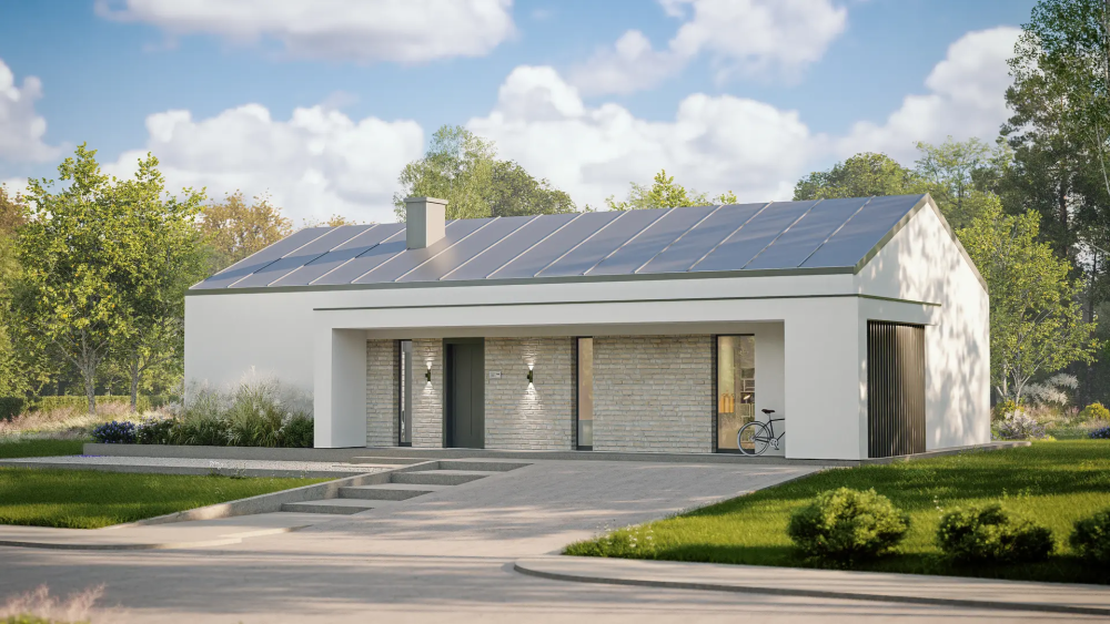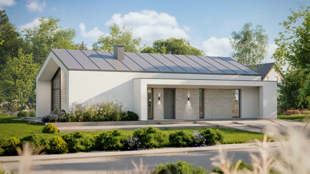 Современный одноэтажный коттедж в минималистичном стиле. Основной объем дома имеет светлую штукатурку. Акцент создает контрастная отделка: темно-серая металлическая кровля, покрывающая низкую двускатную крышу, и вставки из натурального камня светлого оттенка. Ключевой акцент — глубокий навес перед входом, а также большое панорамное остекление во фронтальной части, создающее уютную полуоткрытую террасу.