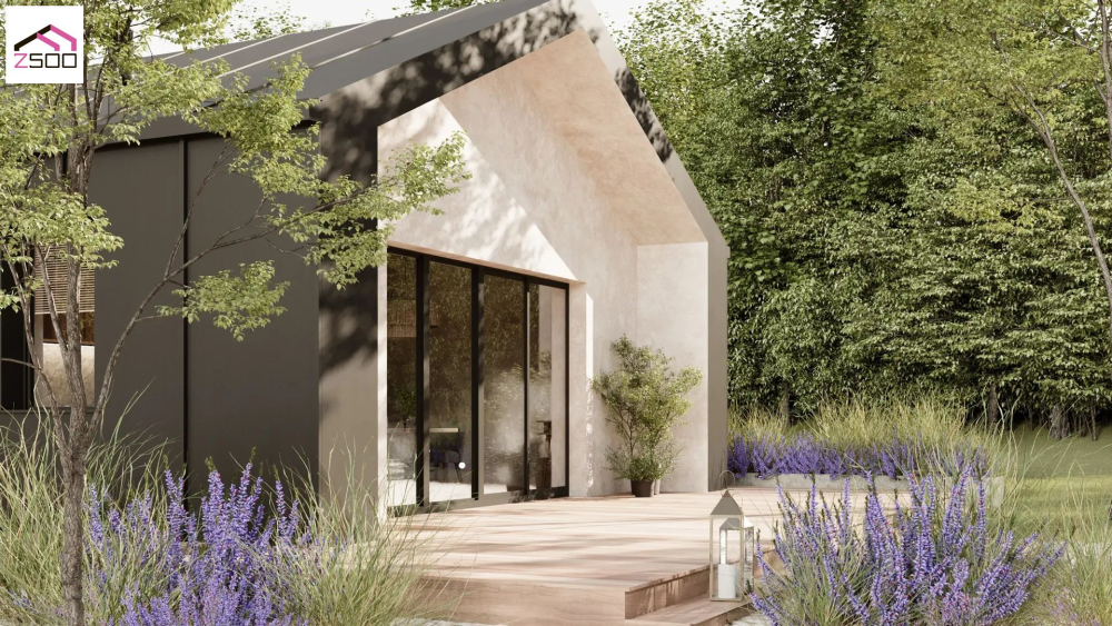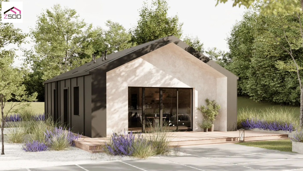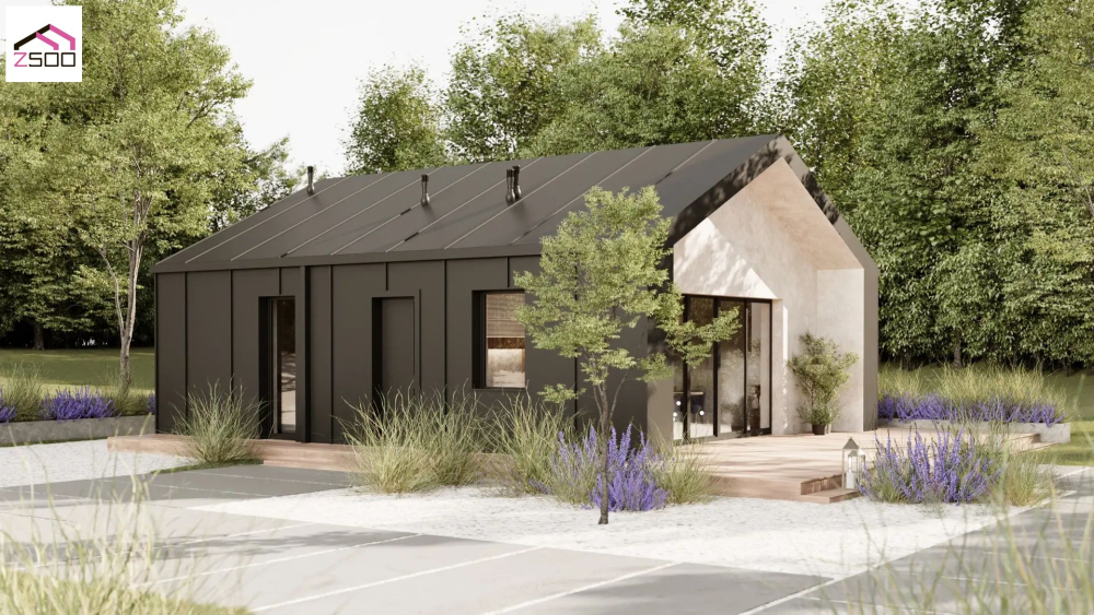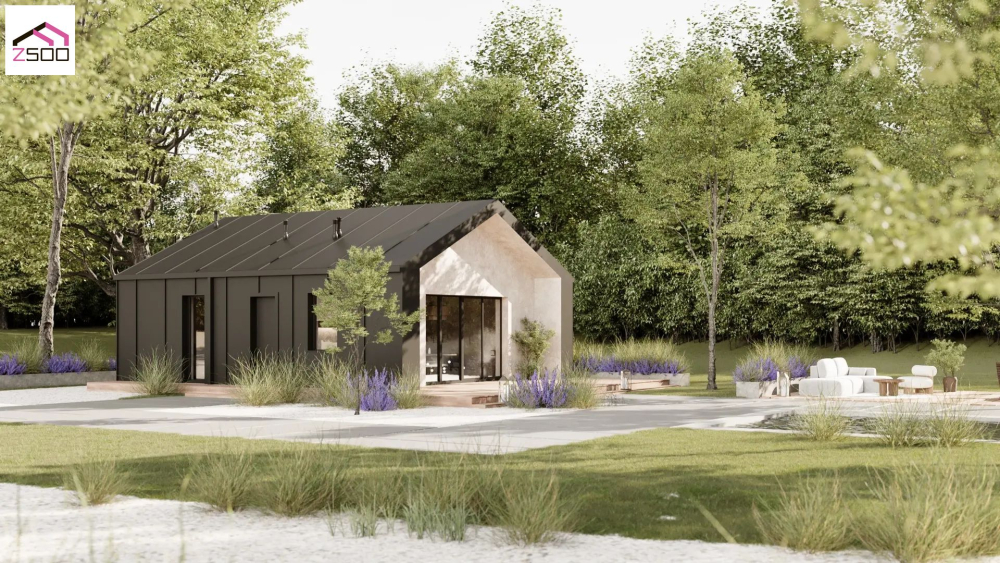 Современный одноэтажный коттедж, привлекающий внимание своим лаконичным дизайном и контрастным сочетанием материалов. Фасады выполнены в темном графитовом цвете с боковой частью, отделанной светлой штукатуркой. Крыша также темная, что создает единый стилистический ансамбль. Большие панорамные окна с темными рамами обеспечивают максимальное проникновение естественного света. Перед домом расположена просторная деревянная терраса, которая идеально подходит для отдыха на свежем воздухе или организации летней столовой.