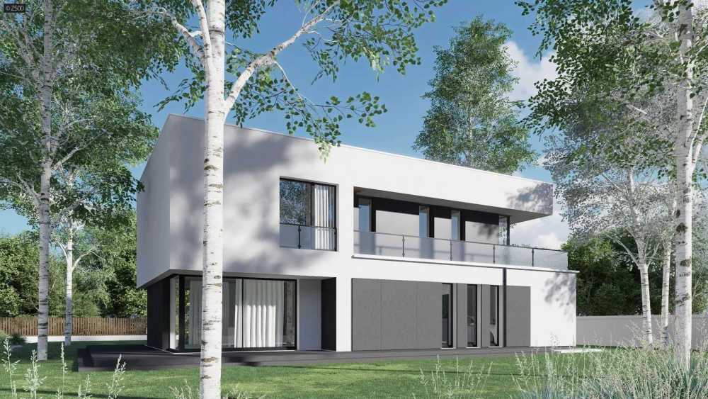 Проект дома Ux214+ - это современный двухэтажный коттедж с плоской крышей, который отлично подходит для строительства на узких участках. Благодаря фасаду шириной всего 9 метров он эффективно использует доступное пространство, сочетая минималистичную архитектуру с функциональностью и комфортом.