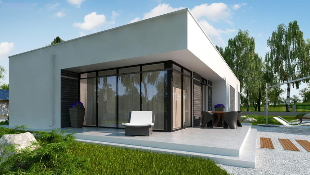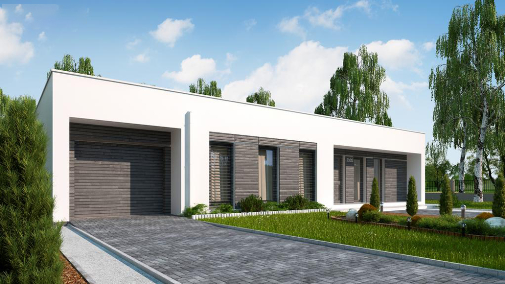 Современный одноэтажный дом с большой светлой гостиной и гаражом