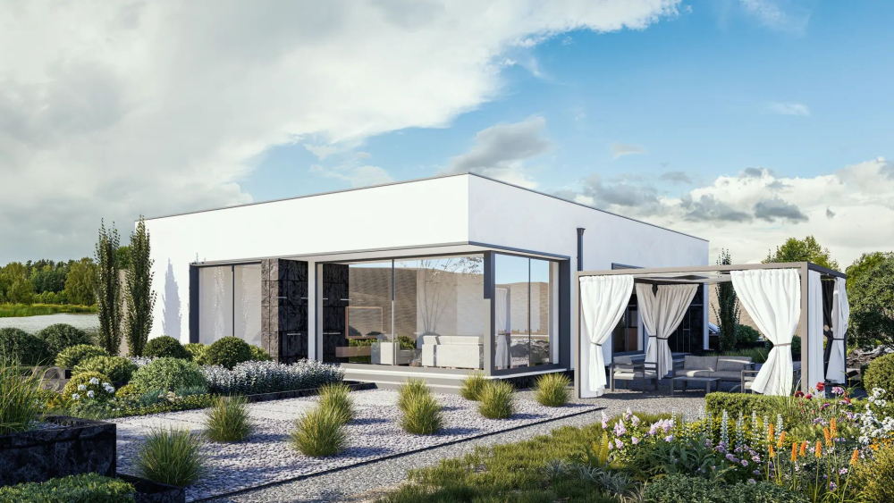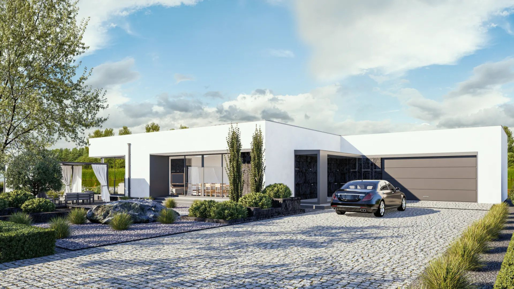 Современный одноэтажный дом с плоской крышей и геометрическими формами. Фасад выглядит стильно благодаря контрастному сочетанию белого и серого цветов.