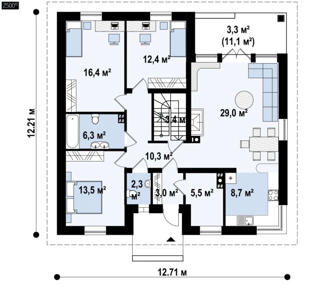 Возможно строительство альтернативных видов кровли, например керамическая плитка, компазитная черепица и т.п., согласно пожеланиям клиента и по подтверждению конструктора.