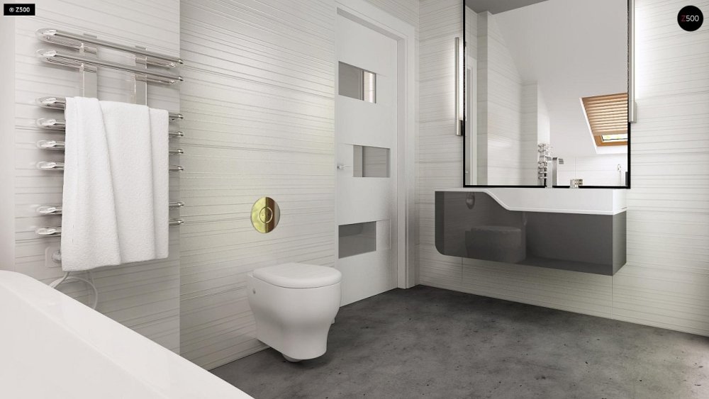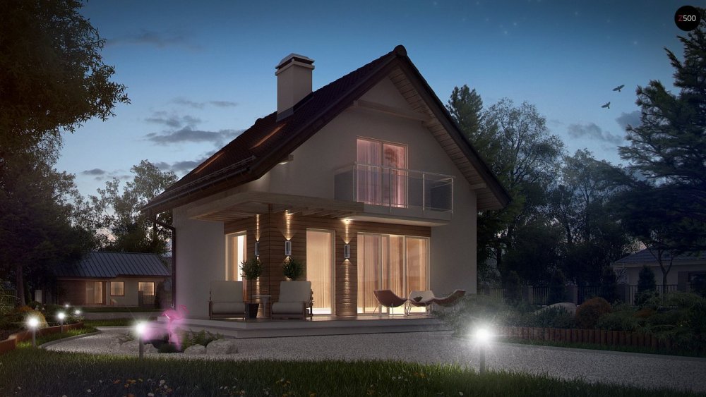 На первом этаже расположена дневная зона, в которую входит гостиная с камином и выходом на террасу, столовая объединена с гостиной и большая кухня, а также прихожая с большим шкафом и небольшая ванная комната. На втором этаже запланирована ванная комната и две большие удобные спальни, одна из которых имеет собственный гардероб, а другой выход на балкон.
