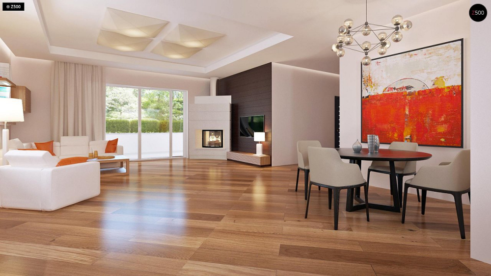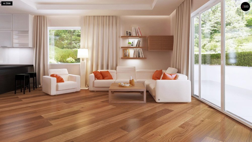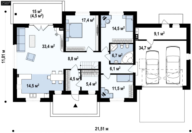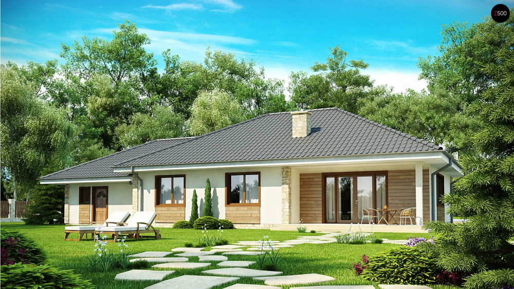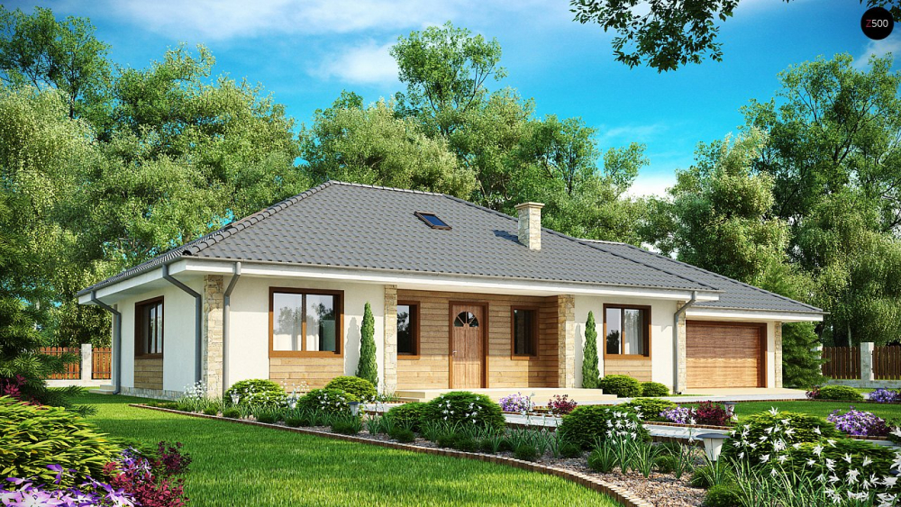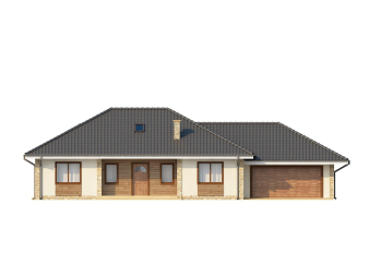 Проект одноэтажного дома с просторной гостиной и гаражом на две машины.