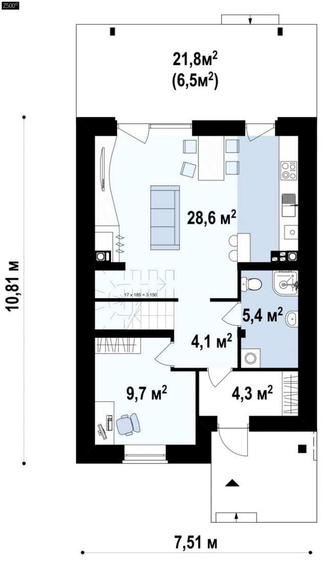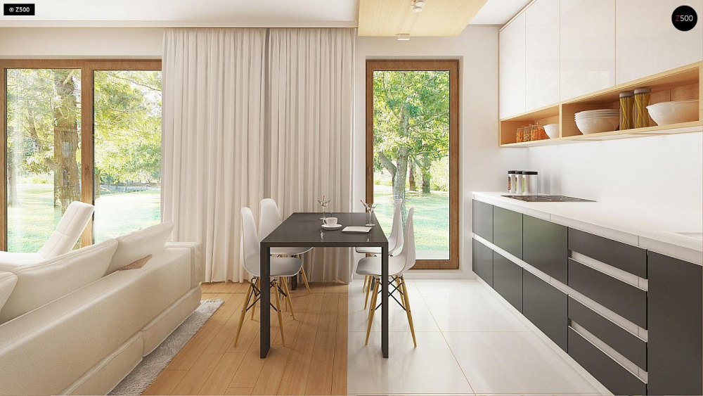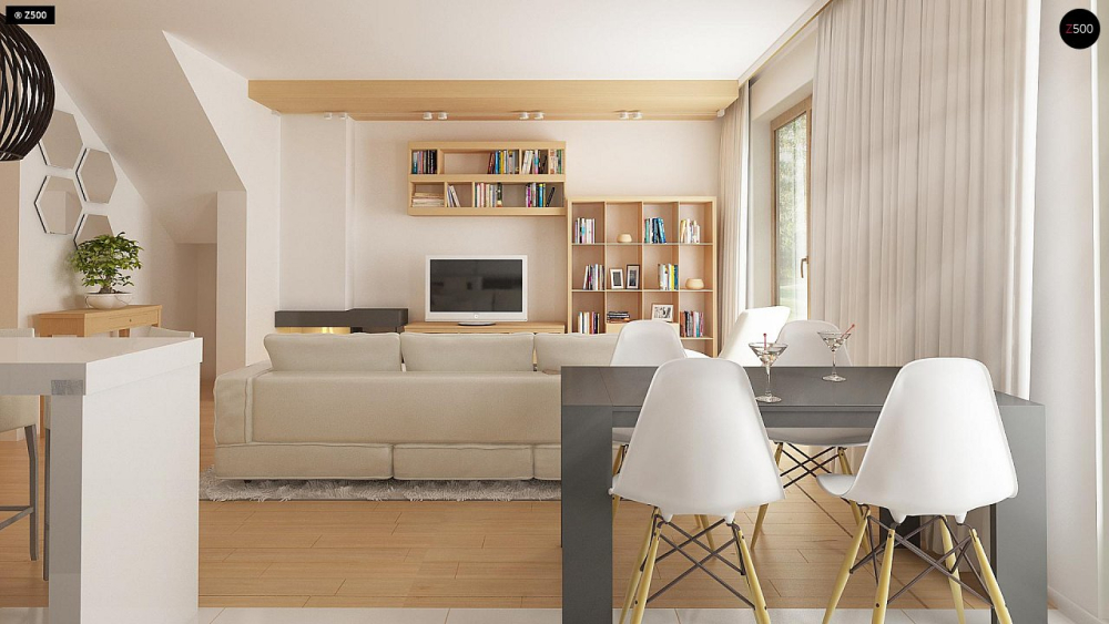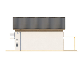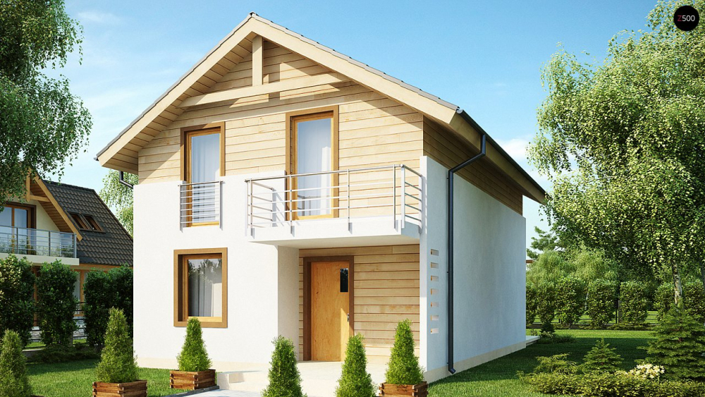 Продольный дом с высокой аттиковой стеной оправдает себя на узком участке.