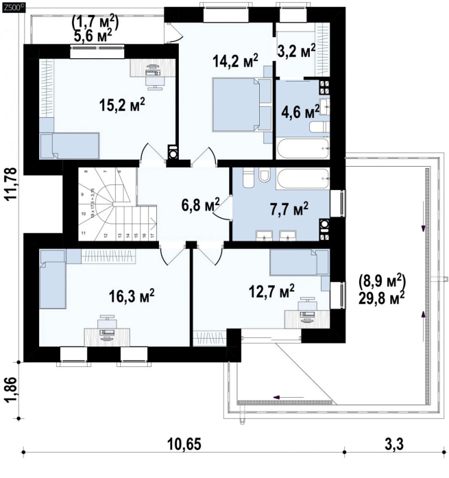 • Узлы - устройство перемычки, коньковый гребень, примыкание к дымовой трубе, подшивка кровли, армирование террасы, опирание перегородок на плиту пола 1-го этажа.