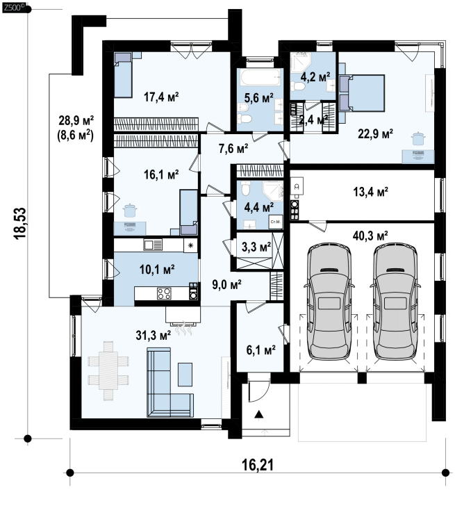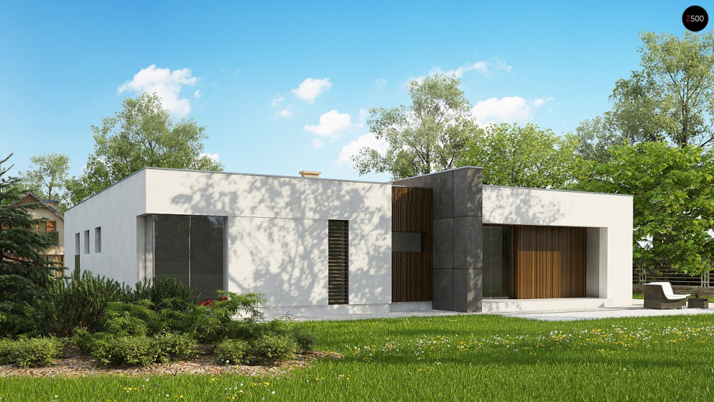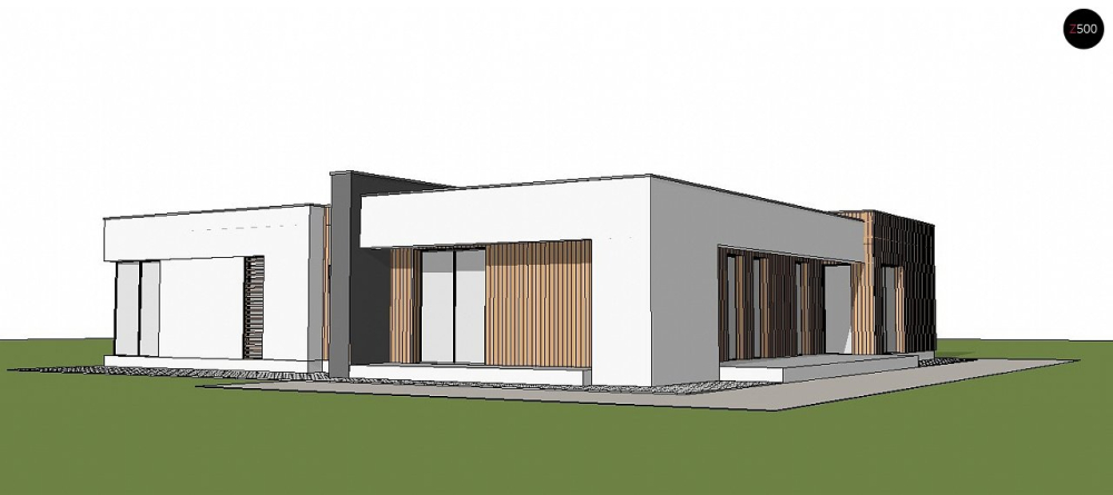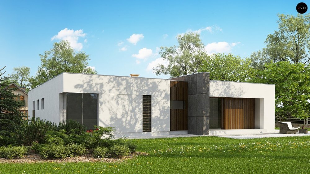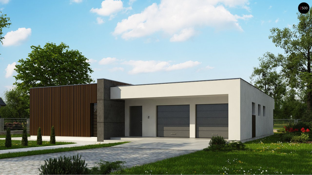 Вариант проекта одноэтажного дома Zx49 c гаражом для двух автомобилей