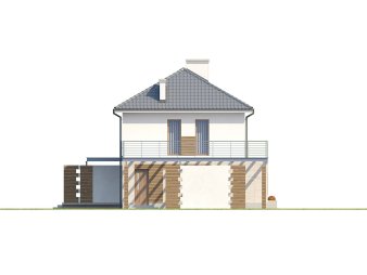 Современный дом с гаражом, навесом для дополнительного автомобиля и большой террасой на втором этаже.