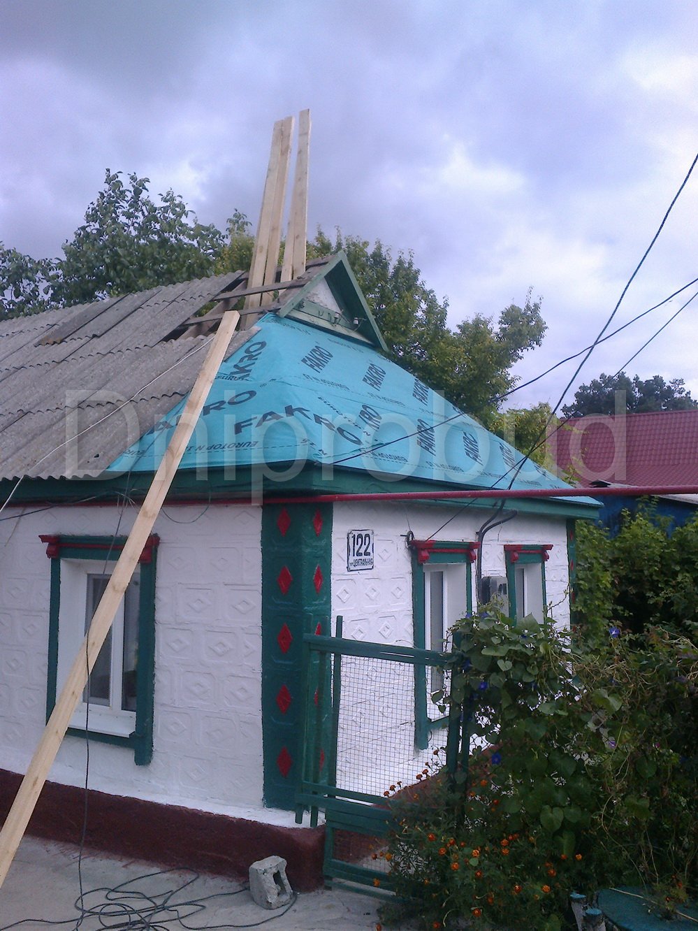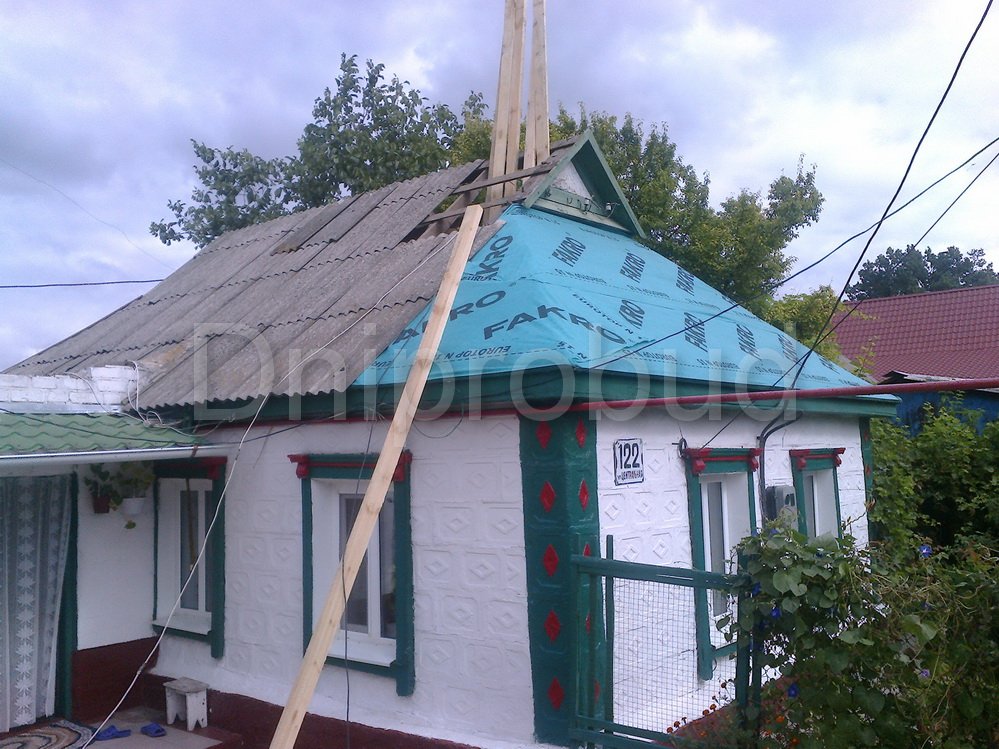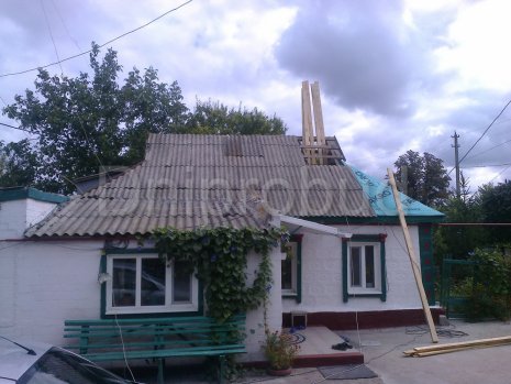 Покрівельні роботи. Реконструкція покрівлі. Монтаж підшивки звисів покрівлі та водостічної системи. Заміна шиферу на металочерепицю, посилення кроквяної системи, гідроізоляція примикань до димоходів.