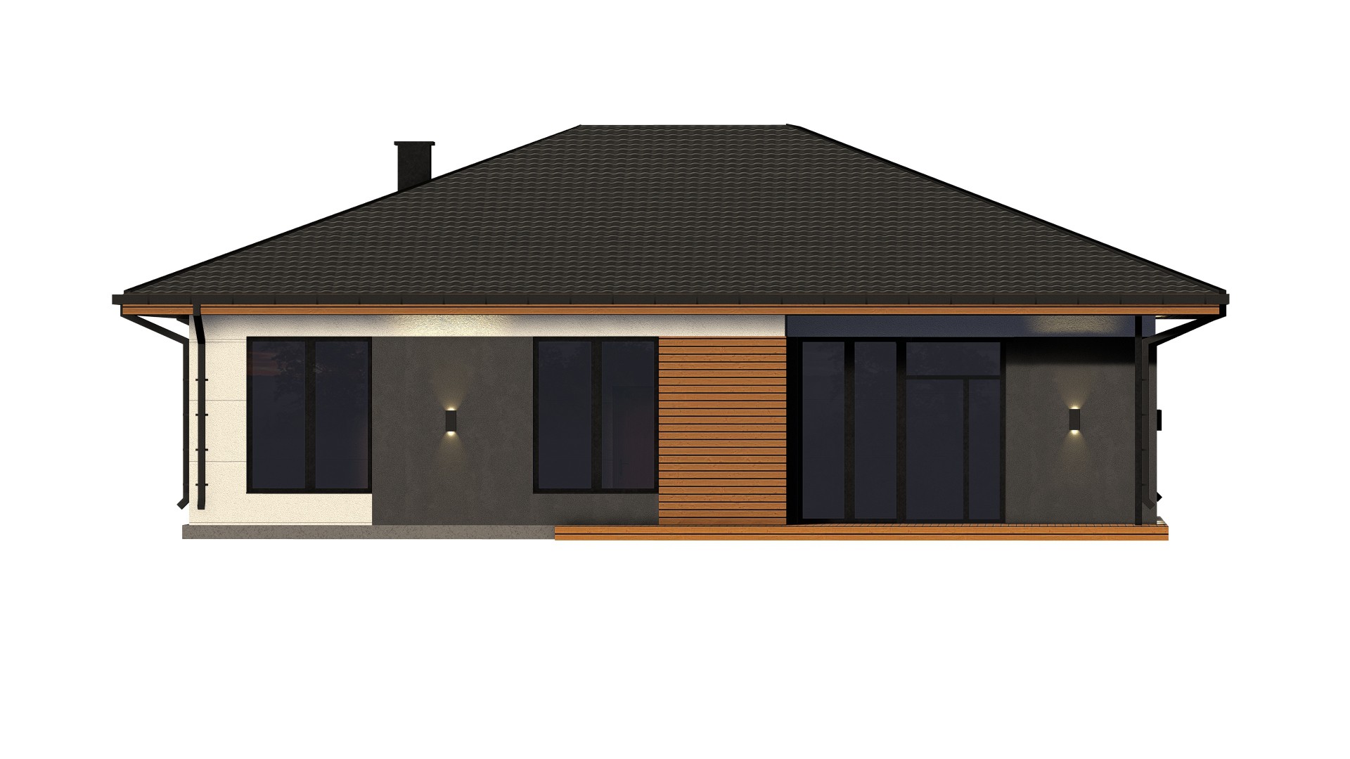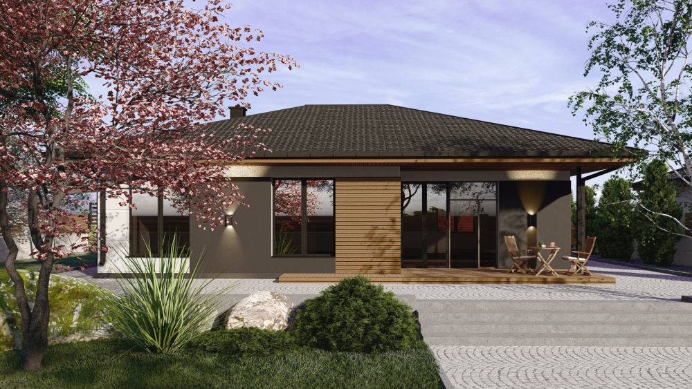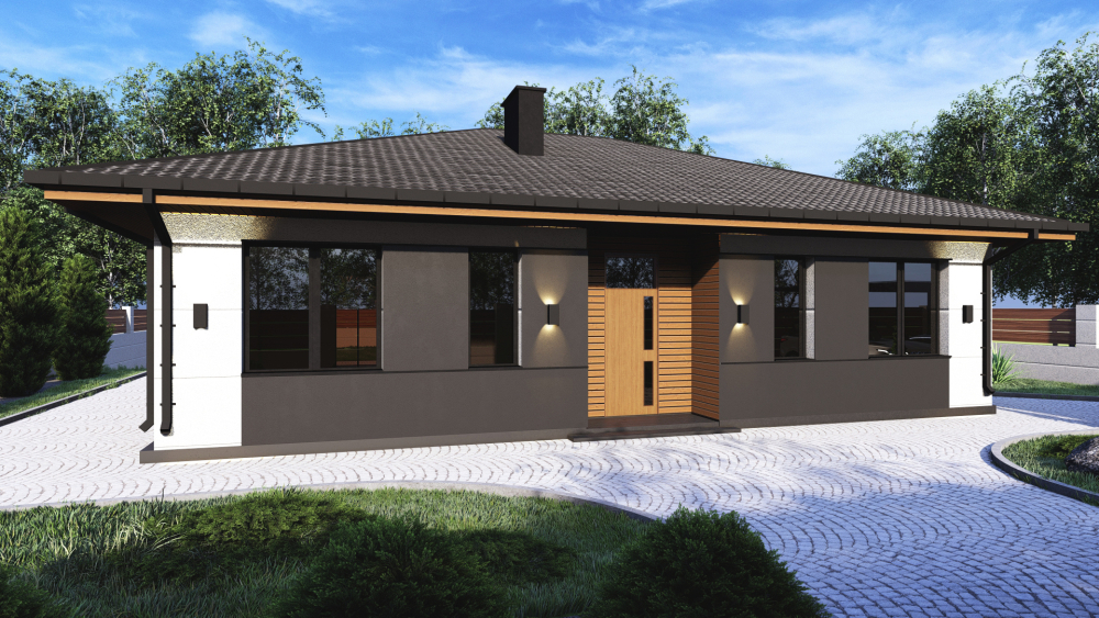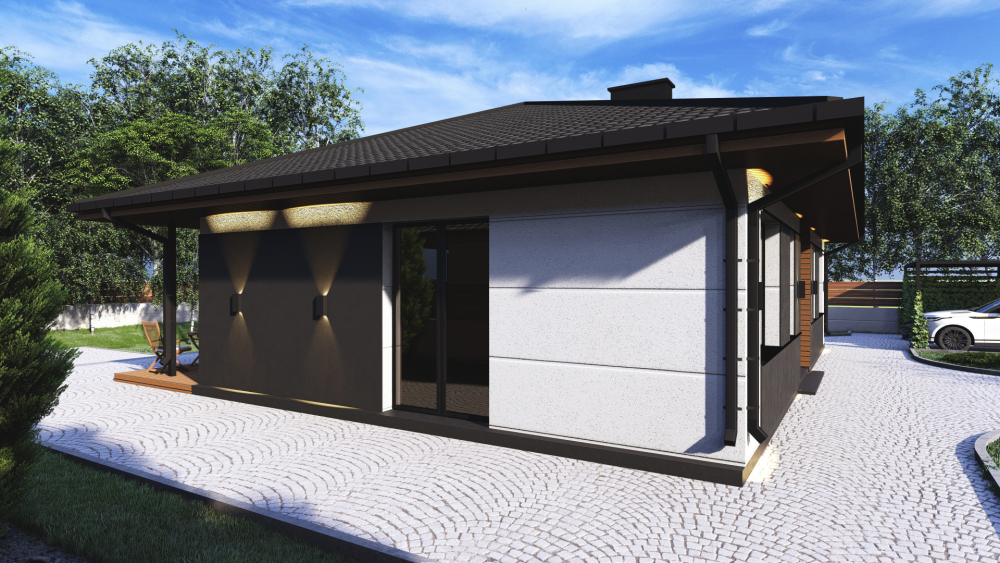 Проєкт одноповерхового будинку DB 12 вирізняється сучасним дизайном і продуманим плануванням, що робить його ідеальним для будь-якої місцевості.