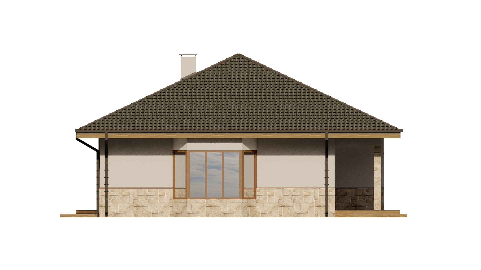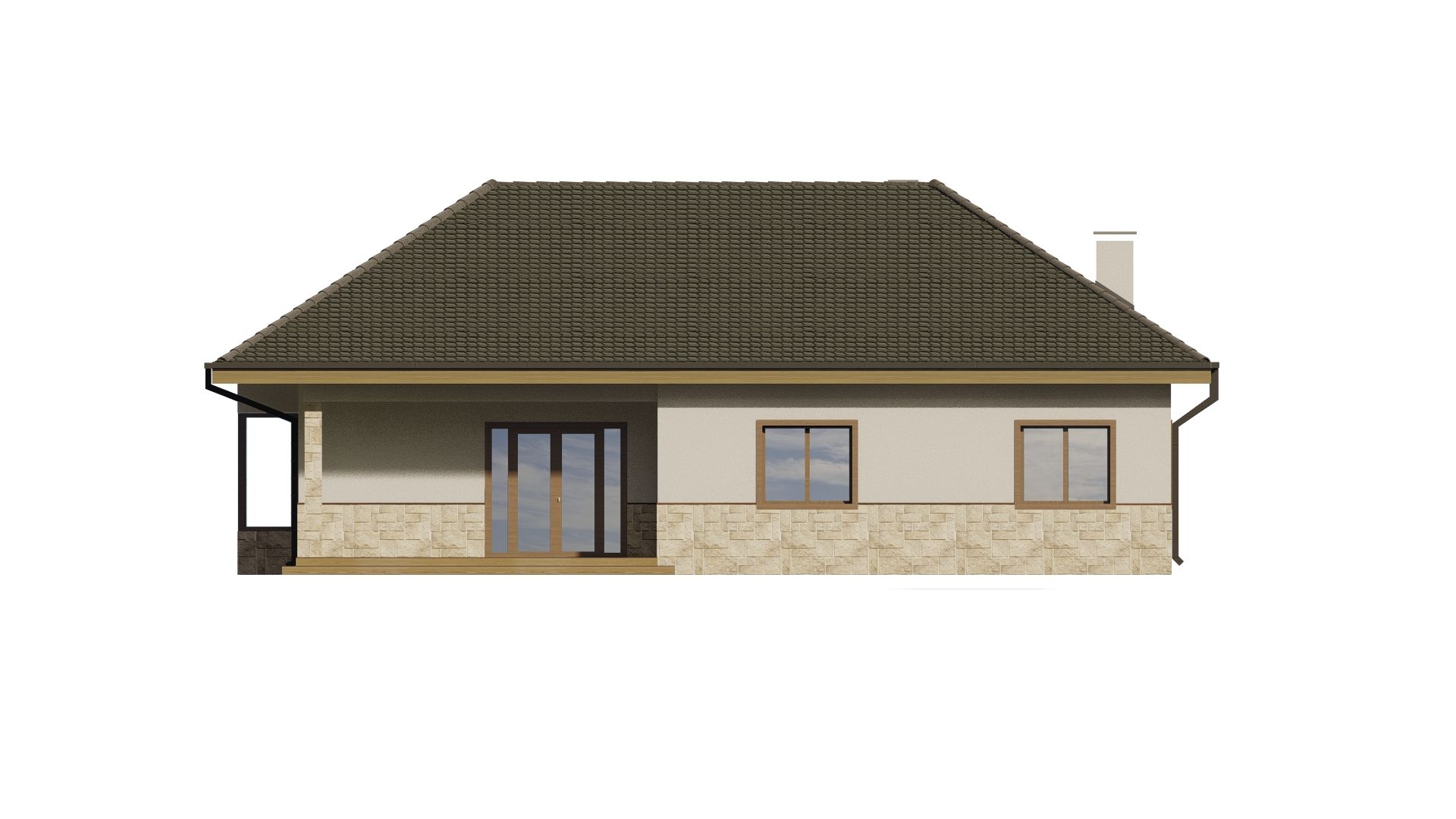 Db 37 — це практичний одноповерховий будинок прямокутної форми. Простий об’єм будівлі доповнений мансардним вікном, скляним виступом над входом і затишною терасою.