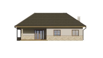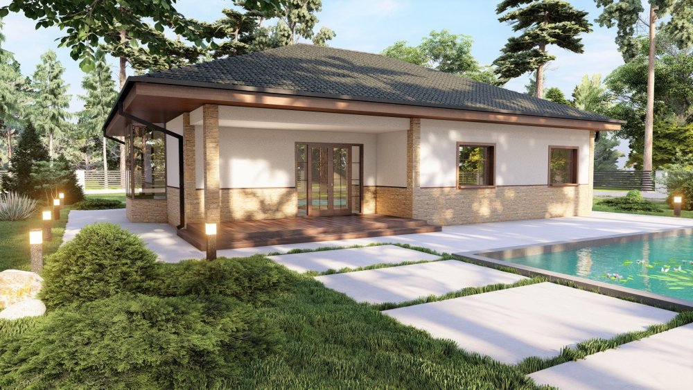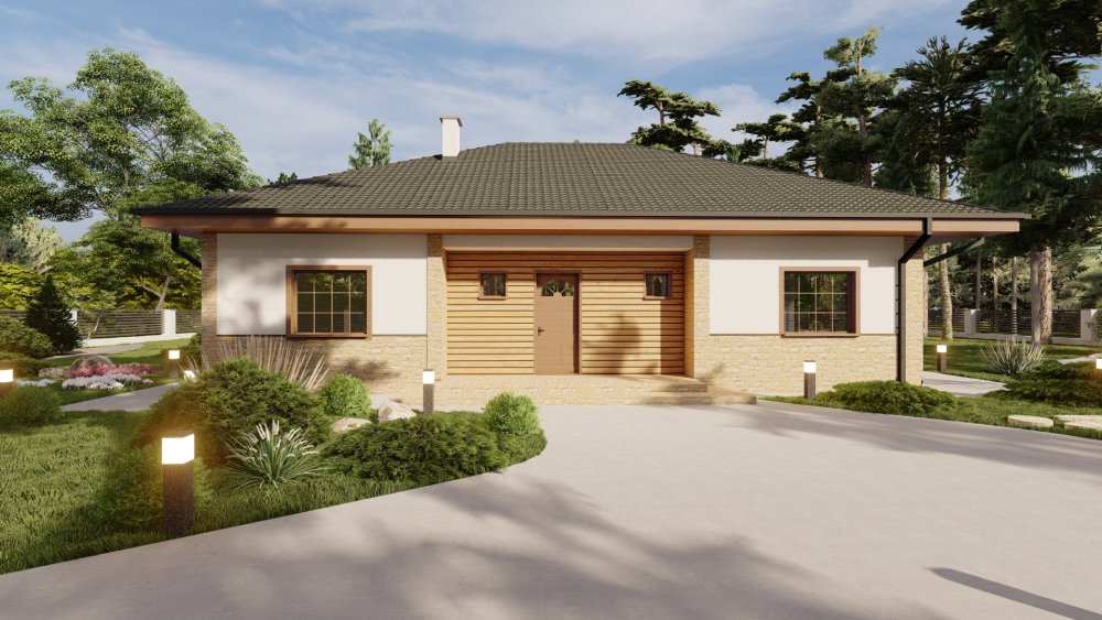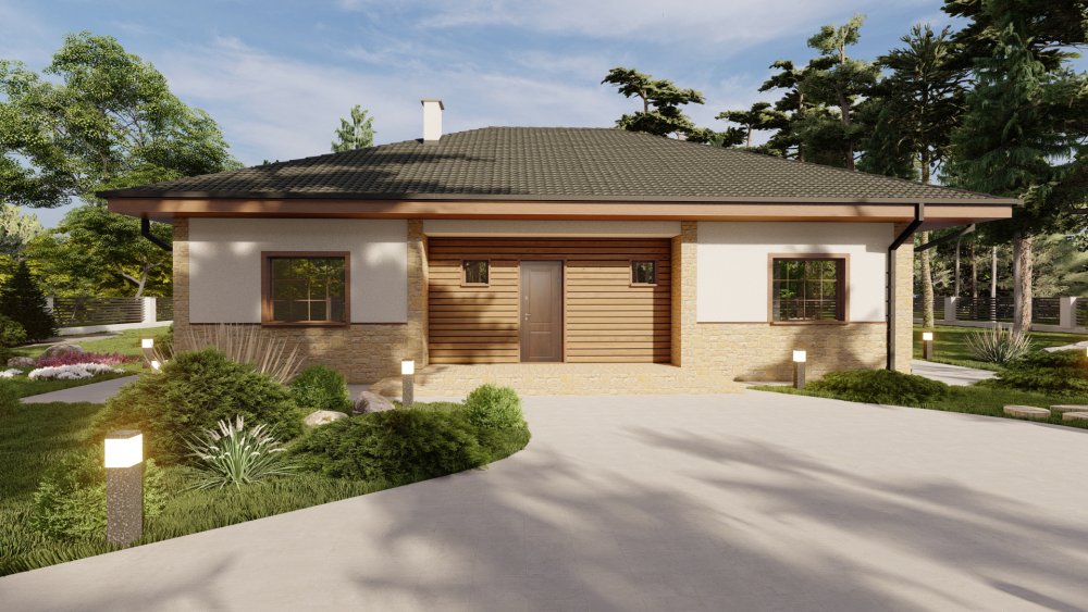 Планування поєднує зону відпочинку та спальну частину. Передбачено багато господарських приміщень: простора комора, технічна та ванна кімната.
