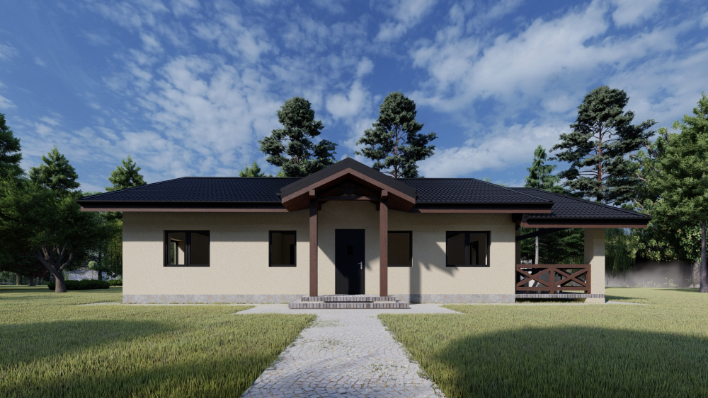 Компактний одноповерховий котедж у стилі «сканди-шале»: світла штукатурка фасадів, відкриті дерев’яні крокви й ферми, темна металочерепиця. Акцент — на великій критій терасі з дерев’яними огорожами, де можна організувати літню їдальню та відпочинкову зону.
