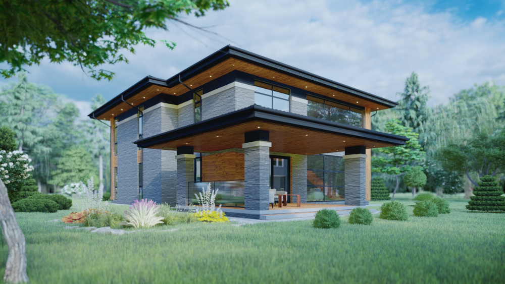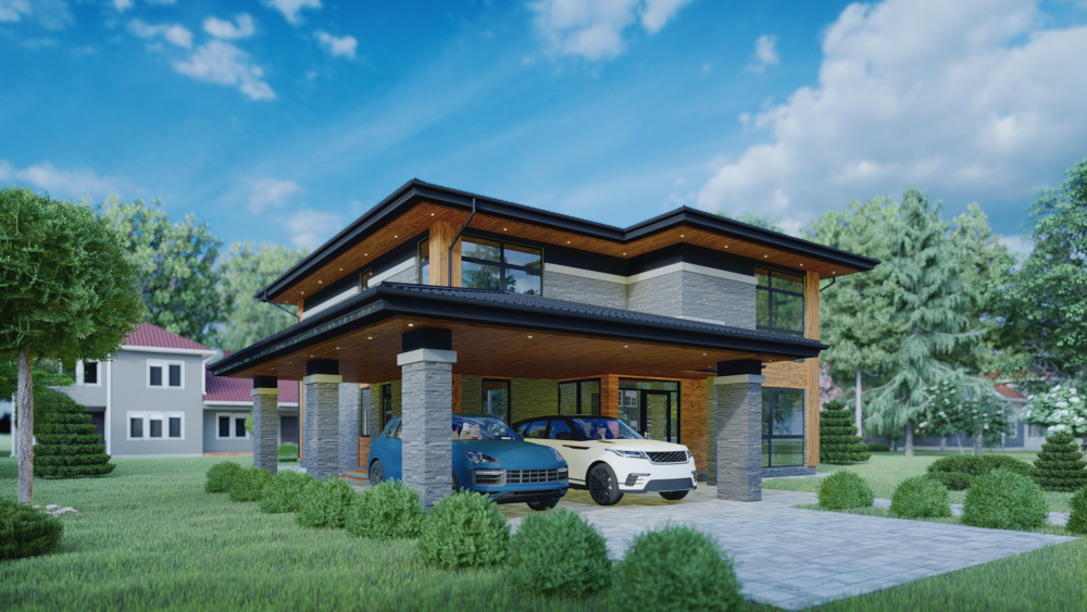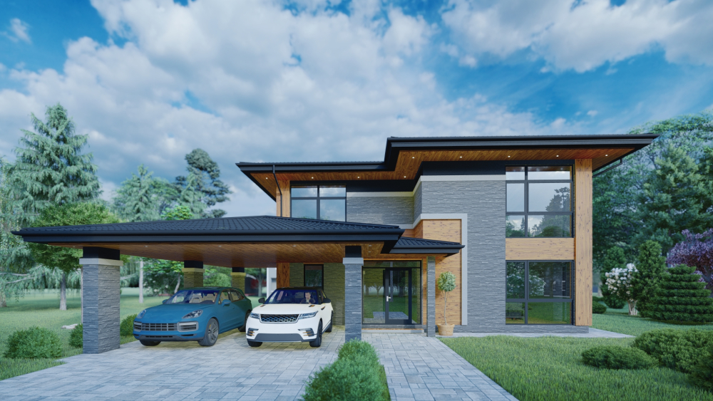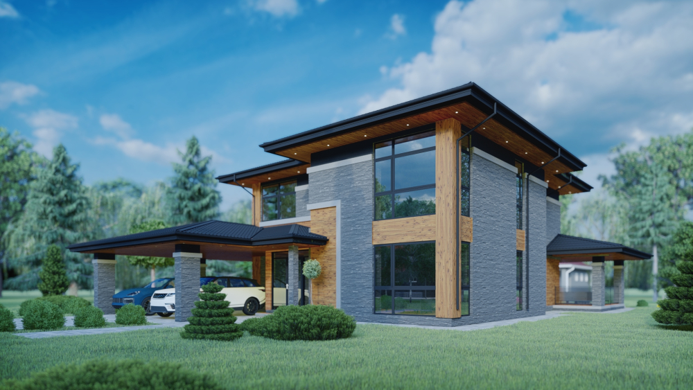 Просторий двоповерховий будинок у сучасному стилі з акцентом на горизонтальних лініях. Фасад виконано з комбінації фактурного сірого каменю та декоративних елементів з теплого дерева. Характерна риса — виносний дах з темним покриттям та підшивкою з дерева, що створюють затишну криту терасу та навіс для автомобілів. Будинок має велику площу скління, включаючи панорамні вікна, котрі забезпечують максимальну інтеграцію інтер'єру з навколишнім ландшафтом.