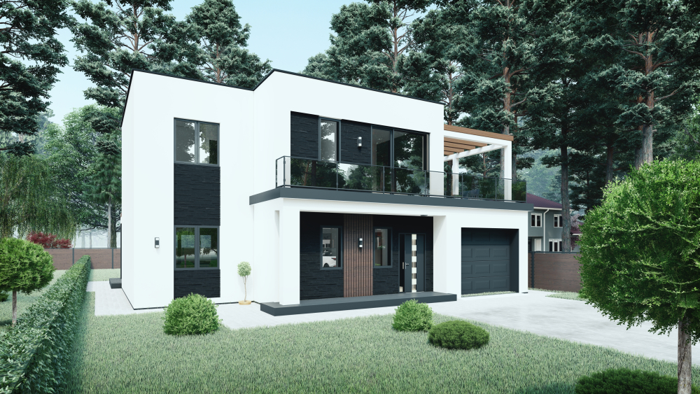 Стильний двоповерховий будинок з чіткими геометричними формами та гаражем. Будинок має велику терасу на першому поверсі, накриту дерев'яною перголою, а також терасу на другому поверсі, також обладнану дерев'яною перголою для затінку. Крім того, на другому поверсі розташований балкон, що додатково розширює житловий простір.