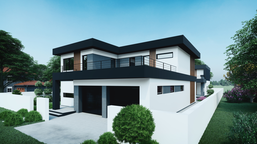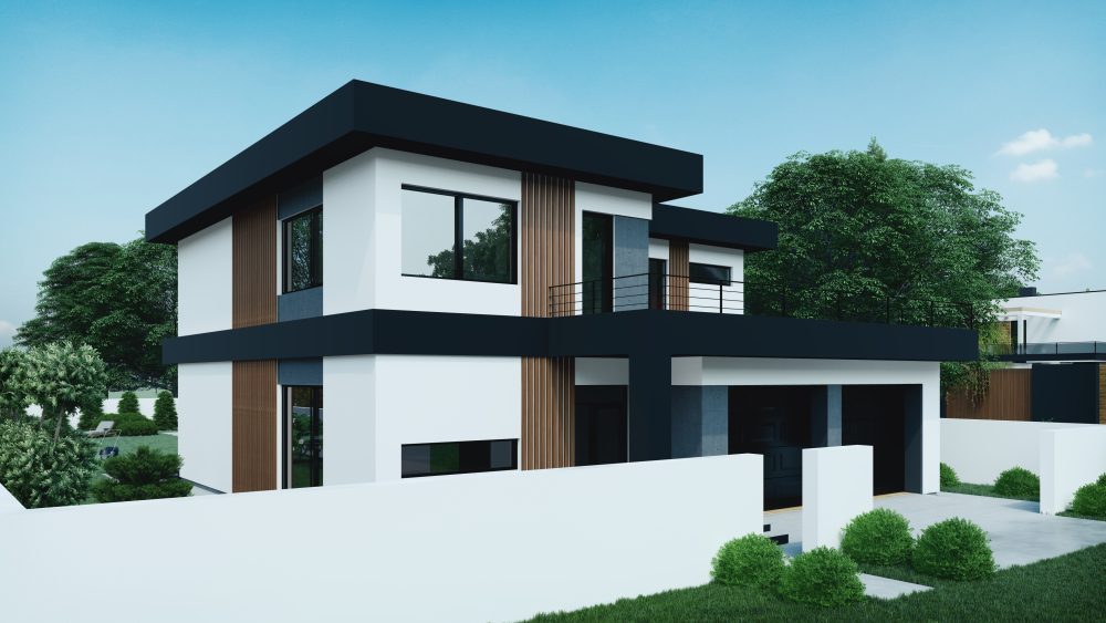 Сучасний двоповерховий котедж з виразними кубічними формами та плоским дахом. В основі дизайну лежить контрастна чорно-біла палітра з додаванням теплої деревної текстури. Фасади оздоблені білою штукатуркою, що контрастує з масивними горизонтальними та вертикальними елементами темно-антрацитового кольору. Додатковий акцент створюють вертикальні вставки з дерев'яних ламелей, що додають тепла і затишку. Будинок відрізняється великою площею скління, що забезпечує максимальне проникнення світла та відкриває краєвиди на ділянку. Ключові функціональні зони включають інтегрований у об'єм будинку гараж на два автомобілі на першому поверсі та простору відкриту терасу на другому поверсі, що розташована над гаражем і має мінімалістичну металеву огорожу.
