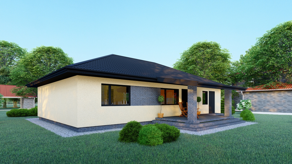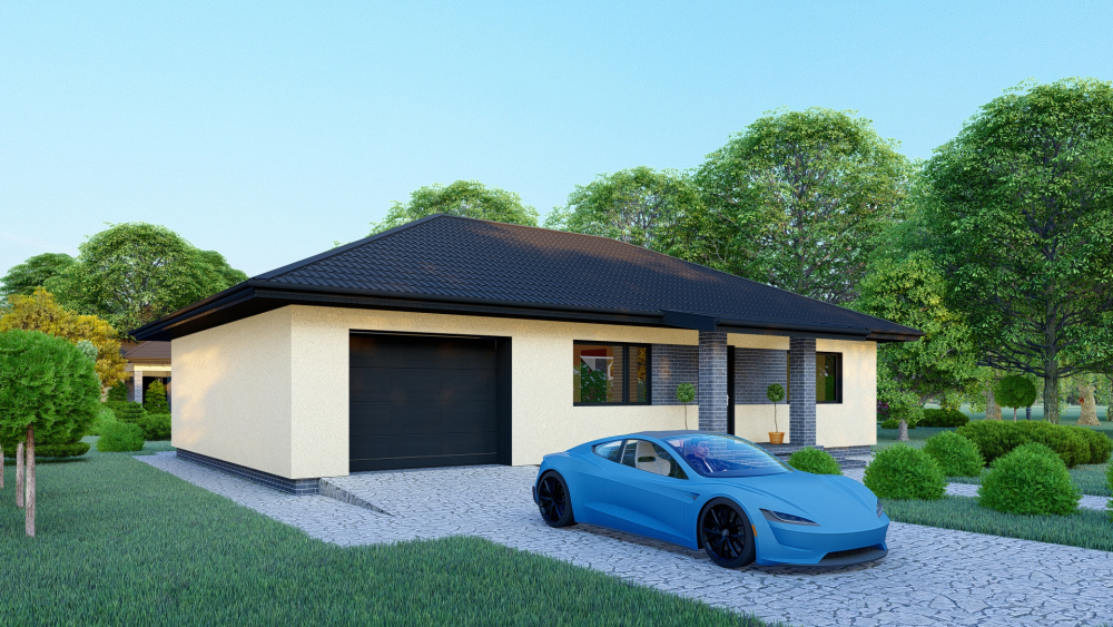 Сучасний одноповерховий будинок з гаражем на одне авто. Фасади виконані в комбінації світлої штукатурки та декоративного облицювання під цеглу в графітово-сірому відтінку. Чотирьохсхилий дах із темного металопрофілю надає будівлі завершеного вигляду та надійно захищає від опадів. Акцент — на затишній критій терасі у дворовій частині, де можна облаштувати зону відпочинку.