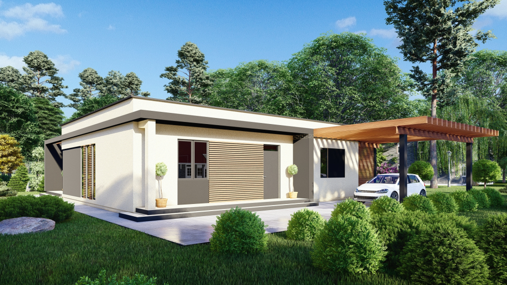 Сучасний одноповерховий будинок з пласким дахом та лаконічними геометричними формами. Фасад оздоблений світлою штукатуркою з контрастними елементами та дерев'яним декором, що додає будівлі тепла. Функціональне планування включає три спальні, простору зону кухні-вітальні та два санітарні вузли. Родзинкою проекту є велика крита тераса з перголою, яка може слугувати навісом для авто або затишною зоною відпочинку.