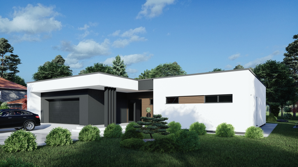 Великий одноповерховий будинок з пласким дахом та гаражем на два автомобілі. Фасад виконано у сучасному стилі з поєднанням білої штукатурки та дерев'яного планкену, що додає будівлі виразності. Планування розраховане на велику родину.