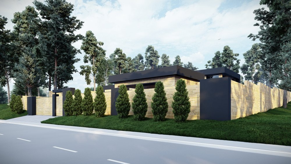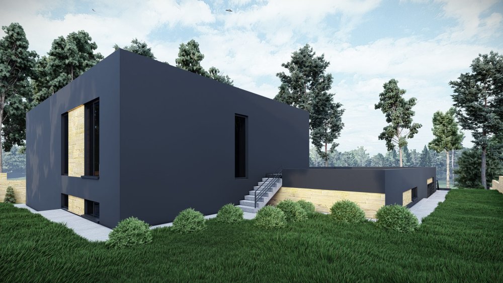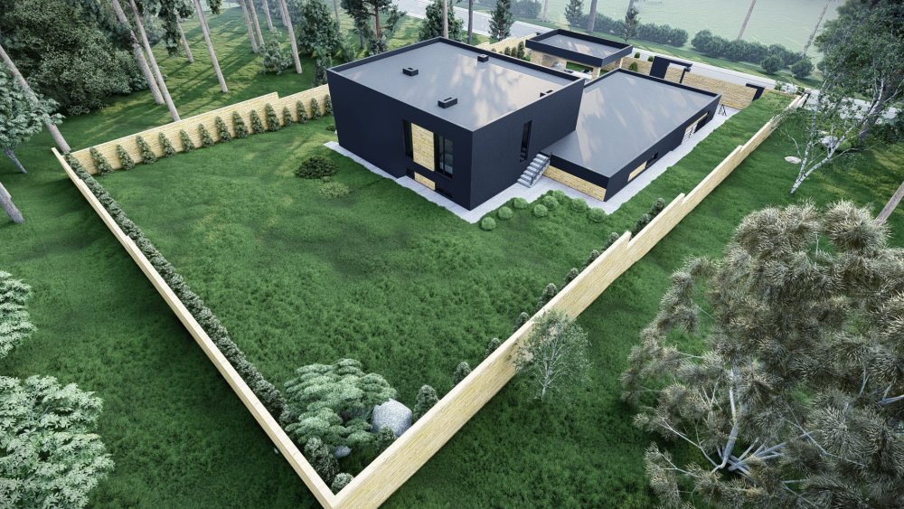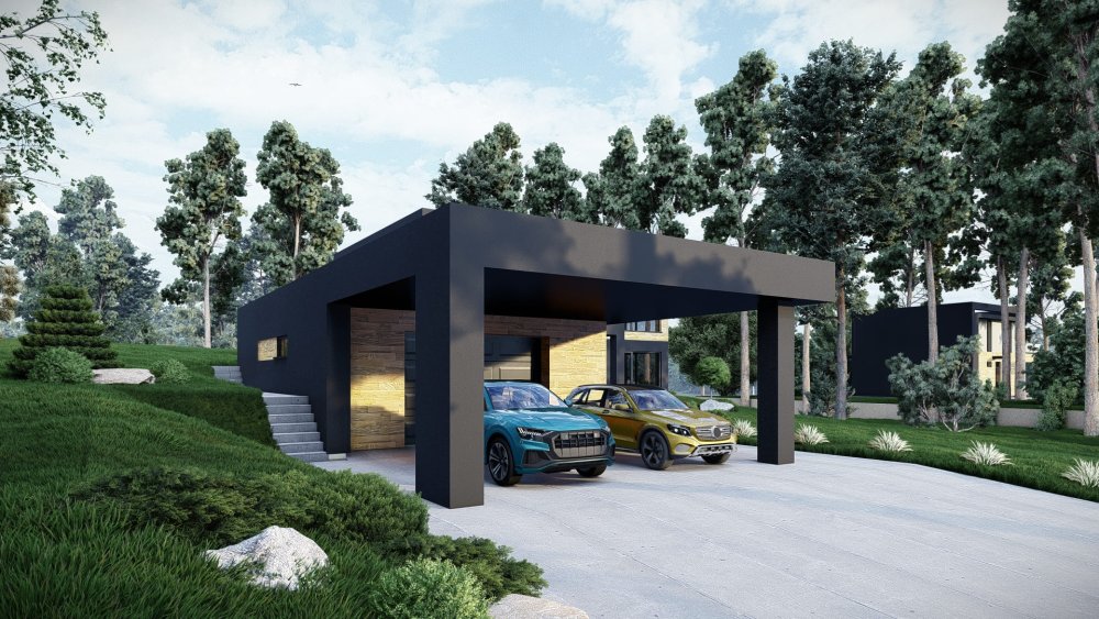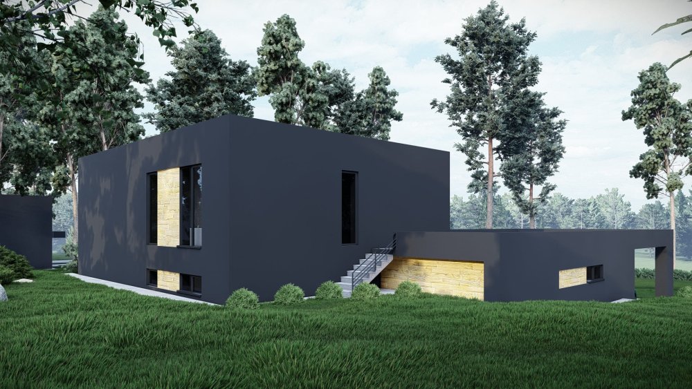 Сучасний одноповерховий будинок у стилі хай-тек з пласким дахом та інтегрованим гаражем на два автомобілі. Фасадне рішення базується на контрасті фактур: світла штукатурка поєднується з темними графітовими елементами та вставками з дерева, що надає будівлі динамічного та стильного вигляду. Особливістю є великий гаражний блок, який органічно вписаний у загальний об'єм будинку.