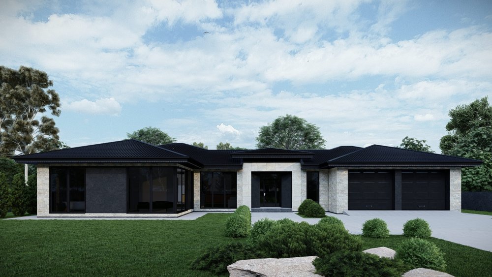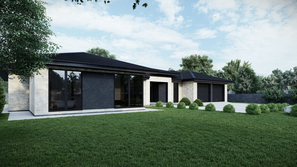 Розкішна одноповерхова резиденція у стилі хай-тек з пласким дахом, що вражає своїми масштабами та продуманим плануванням. Фасад виконаний у сучасному стилі з використанням контрастних кольорів та панорамного скління. Центральним елементом інтер'єру є грандіозний відкритий простір вітальні-кухні площею майже 94 м². Будинок має три спальні, одна з яких являє собою окремий блок (майстер-спальню) з власною великою ванною кімнатою та двома гардеробними. Також передбачено величезний гараж на два авто та численні підсобні приміщення.