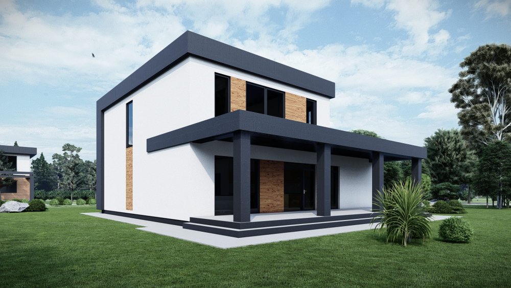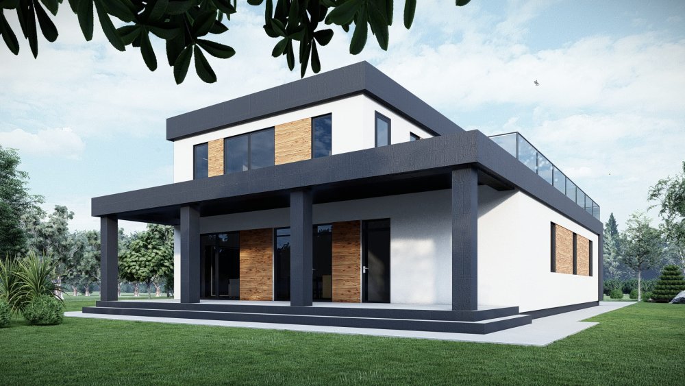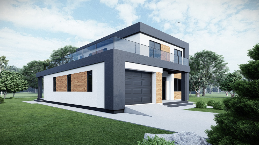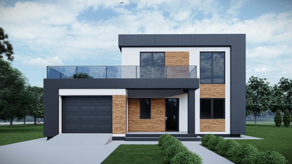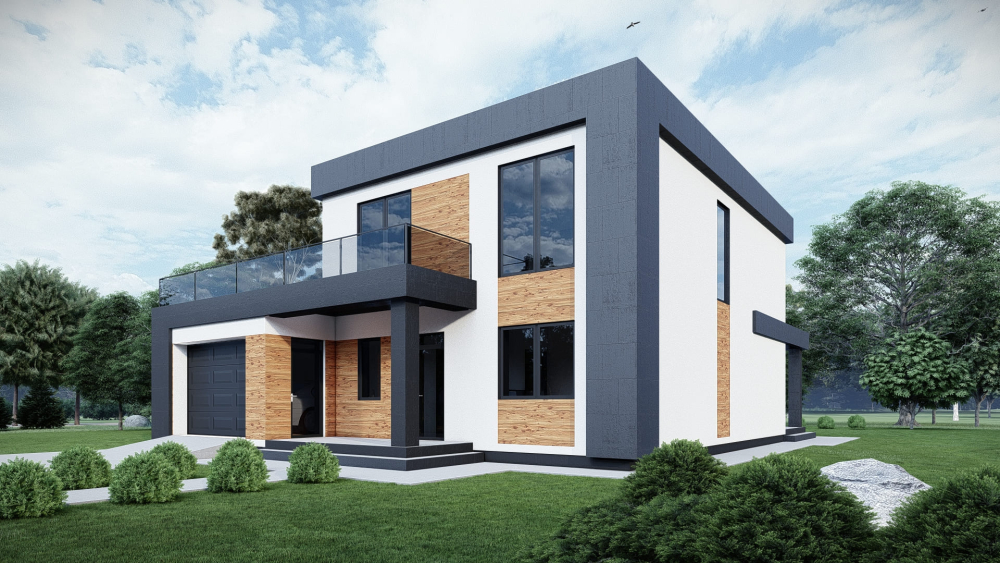 Великий двоповерховий будинок у стилі хай-тек з плоским дахом, розрахований на велику родину. Фасад має сучасний вигляд завдяки поєднанню білої штукатурки, темних графітових елементів та вставок під дерево. Особливістю є великий гараж та відкрита тераса на другому поверсі.