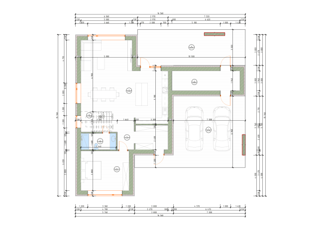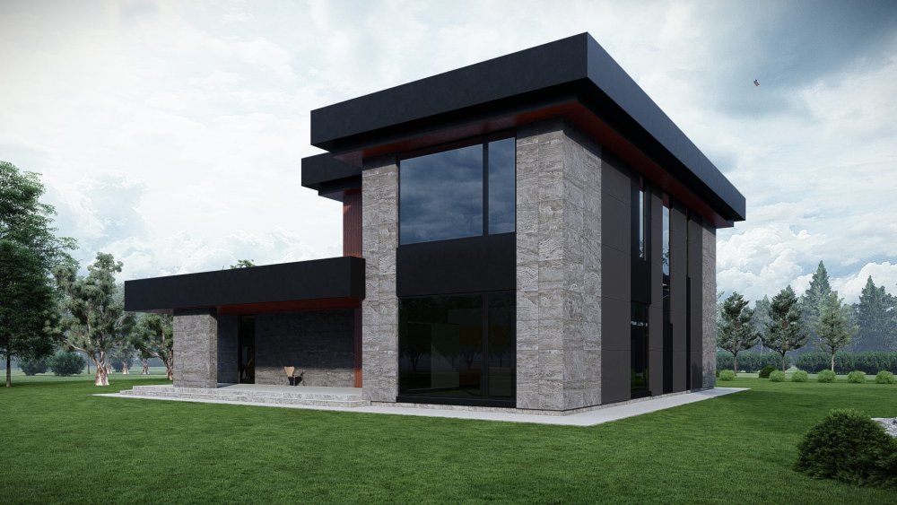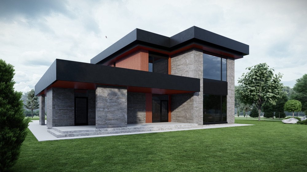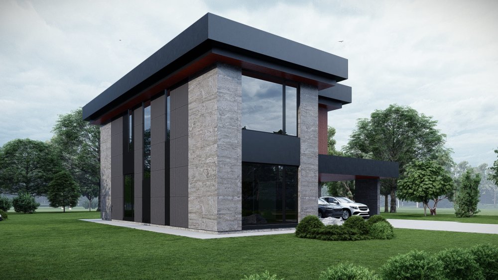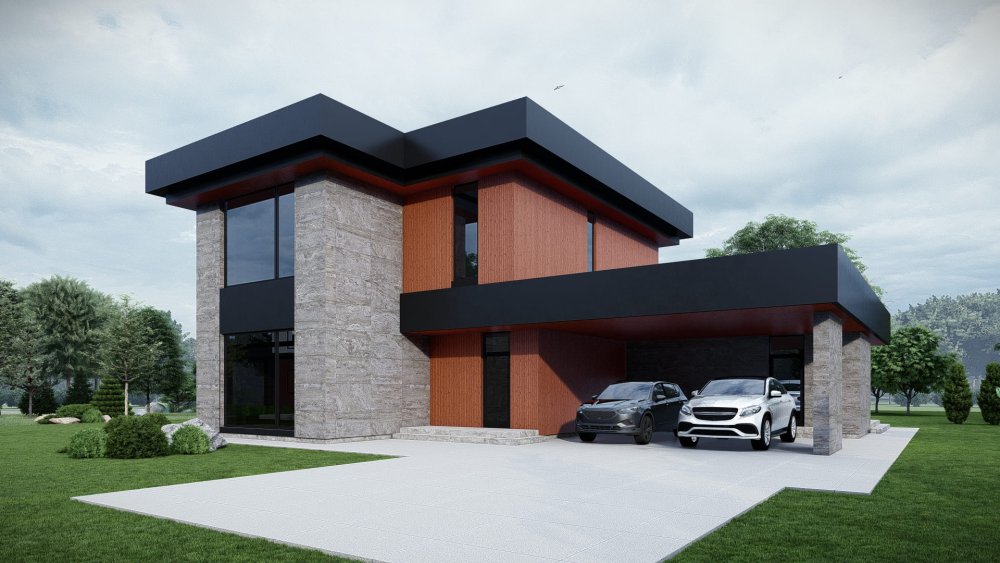 Сучасний двоповерховий будинок з плоским дахом та великим навісом для двох автомобілів. Фасад оздоблений комбінацією фактурної плитки під бетон та теплого дерева, що створює ефектний та стильний вигляд. Проєкт відрізняється унікальним плануванням, де основна житлова зона розташована на першому поверсі, а на другому поверсі знаходиться спальна зона з трьома додатковими кімнатами. Це ідеальне рішення для великої родини, що цінує простір та приватність.