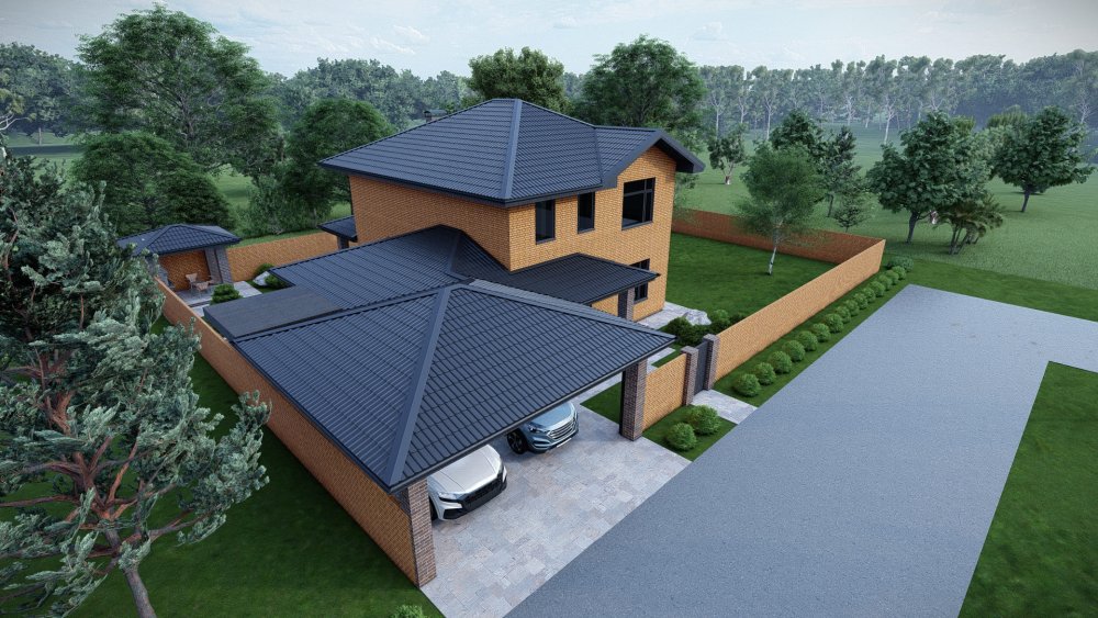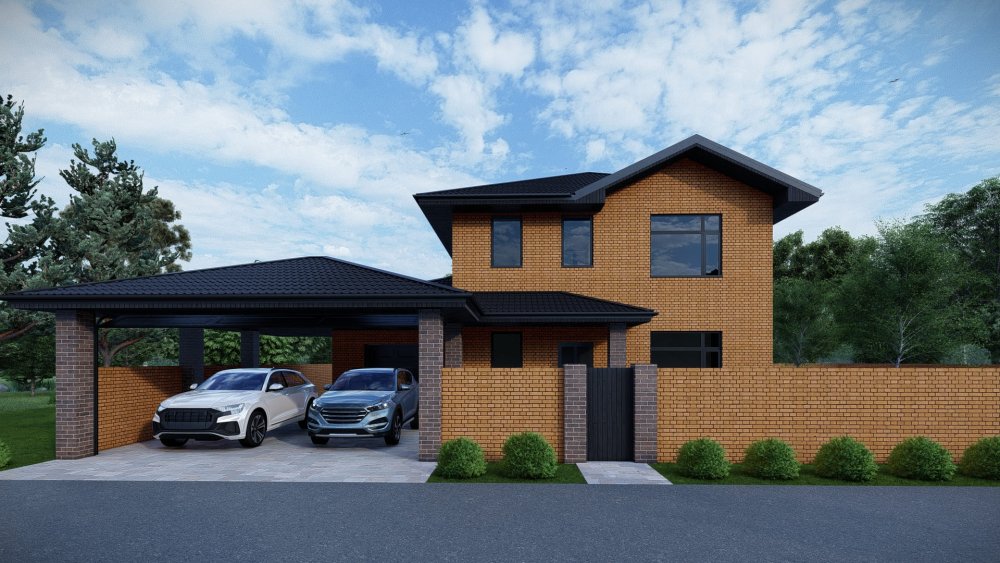Сучасний двоповерховий будинок у стилі хай-тек з багатосхилим дахом та великим навісом для двох автомобілів. Фасад оздоблений комбінацією фактурної плитки під камінь та теплого дерева, що створює ефектний та стильний вигляд. Це ідеальне рішення для великої родини, що цінує простір та приватність.
