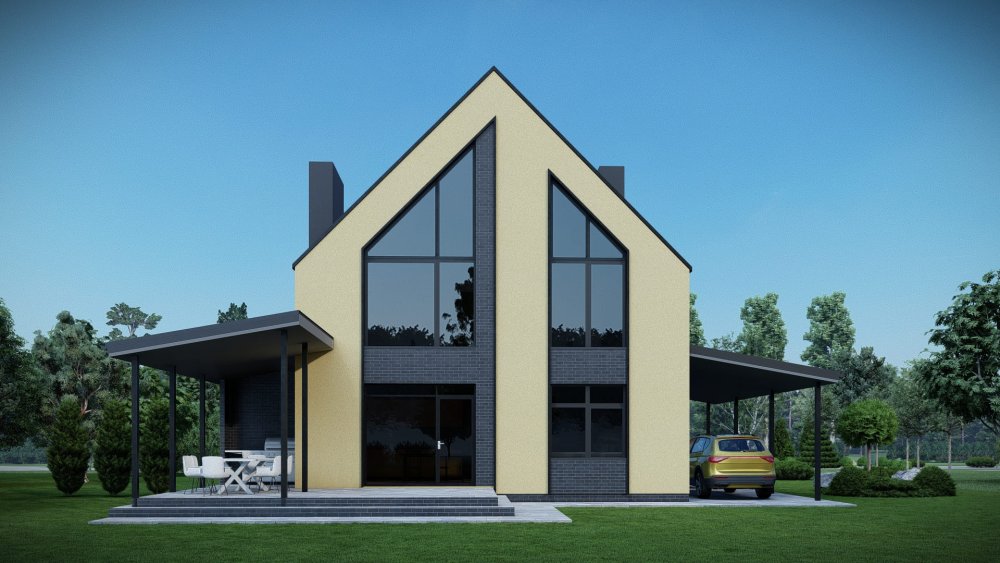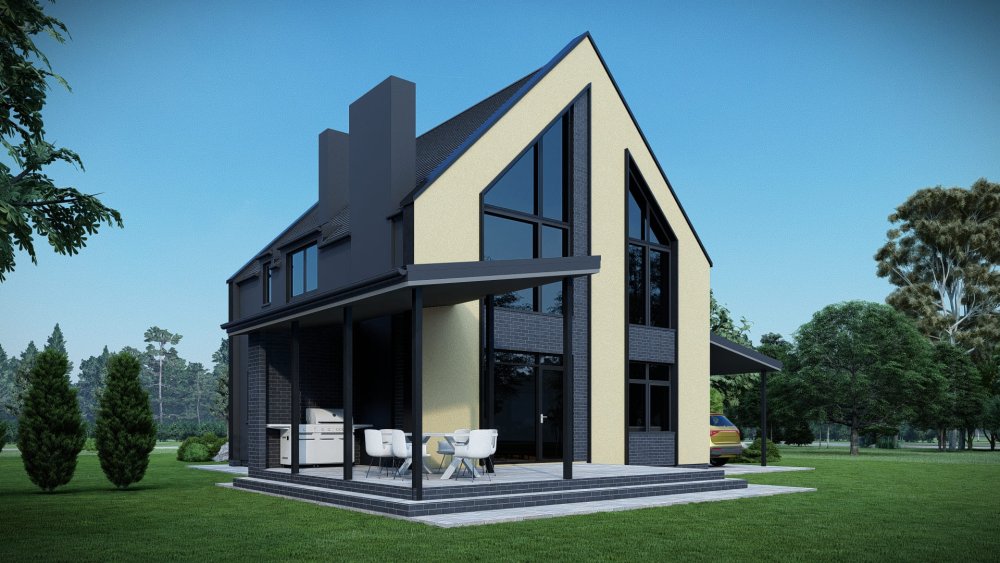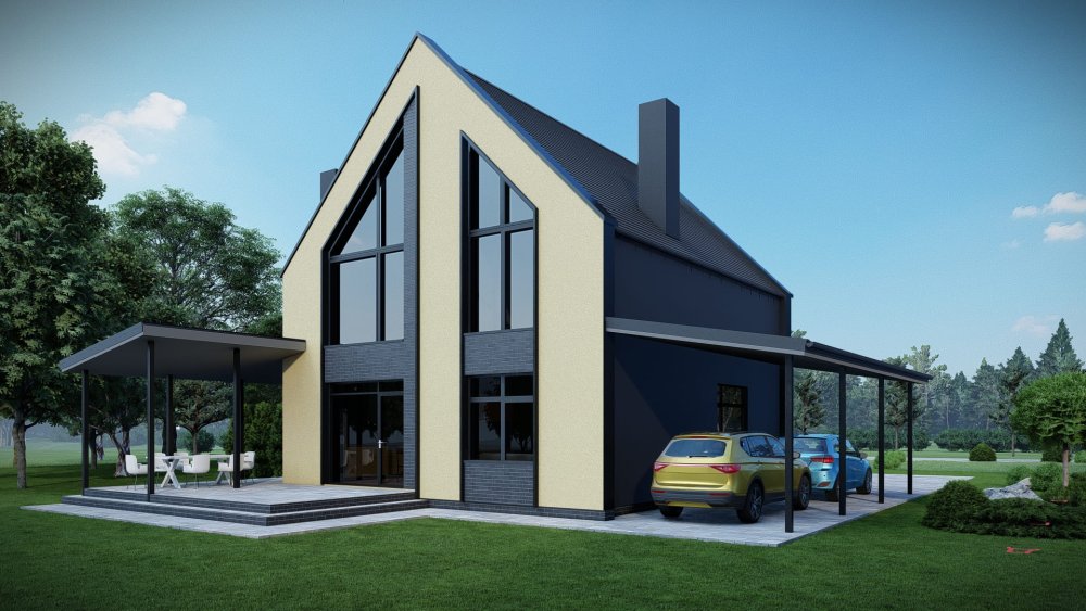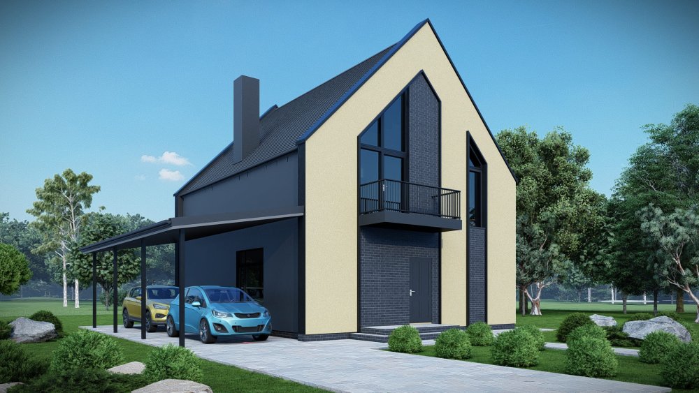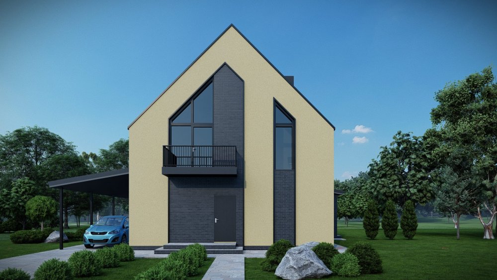 Компактний двоповерховий будинок у сучасному стилі з двосхилим дахом. Фасад поєднує світлу штукатурку з контрастними вставками та виразними віконними рамами, що надає будівлі стильного вигляду. Будинок доповнений великою критою терасою та навісом для автомобіля.