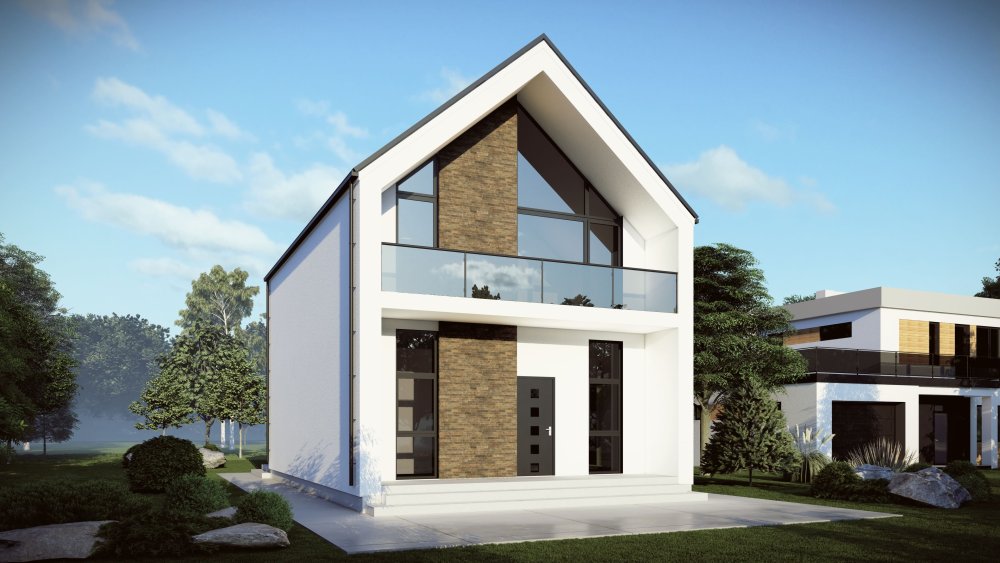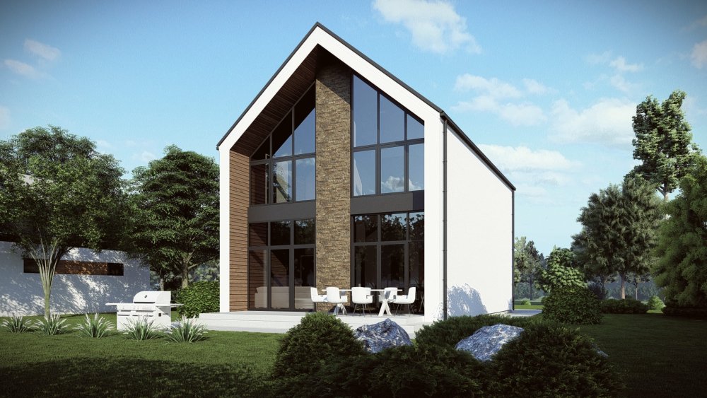 Компактний двоповерховий будинок з високим двосхилим дахом. Фасад вирізняється вражаючим панорамним склінням фронтону та контрастним поєднанням білої штукатурки з темними акцентами та дерев'яними вставками. Будинок доповнений балконом на другому поверсі та зовнішньою терасою.