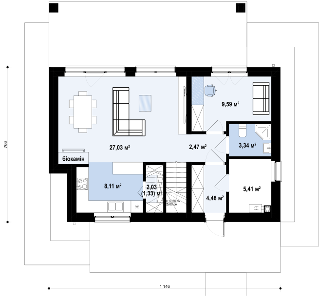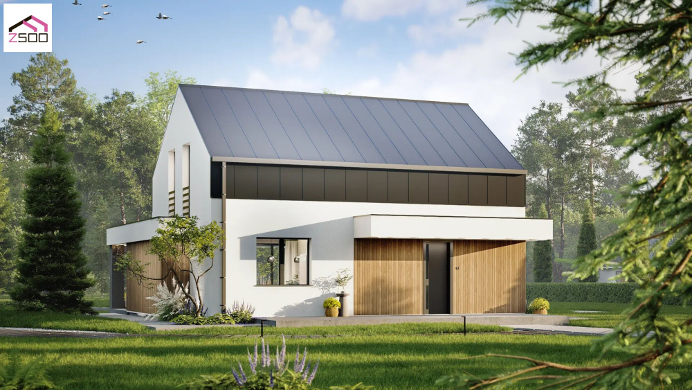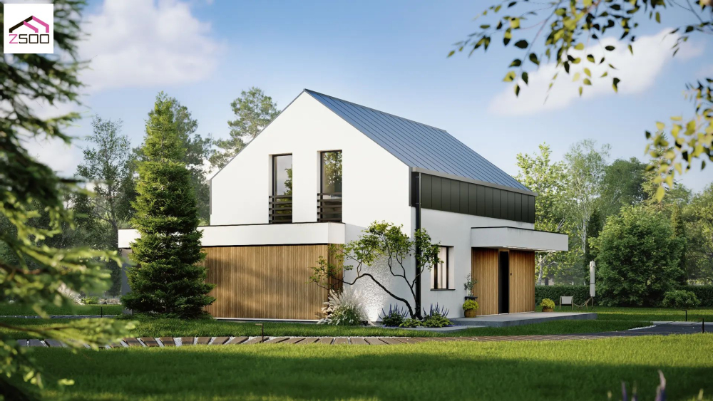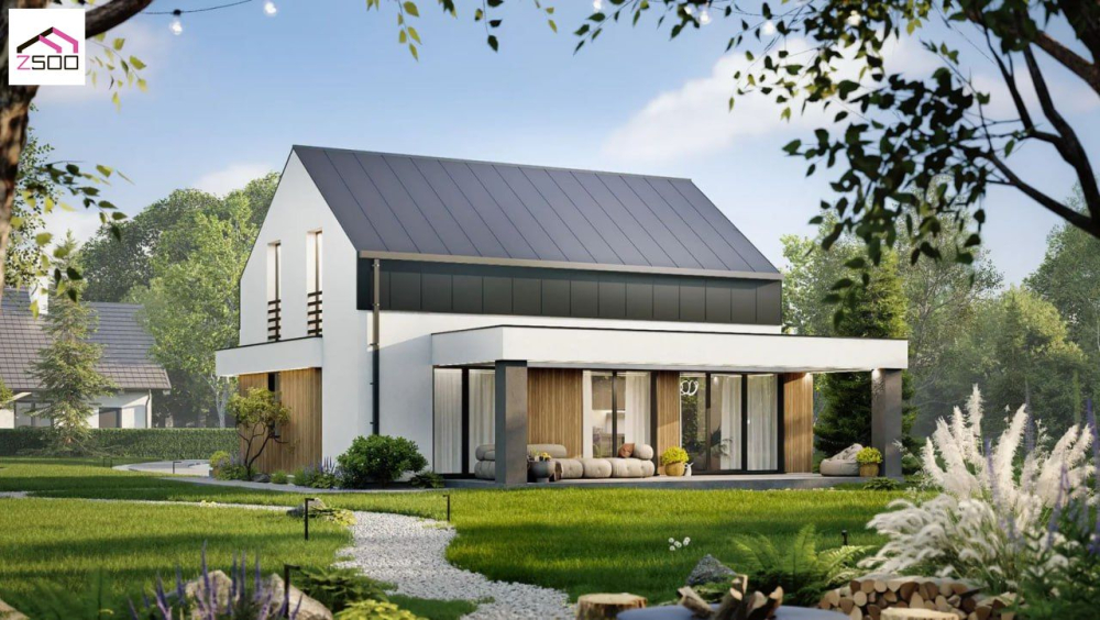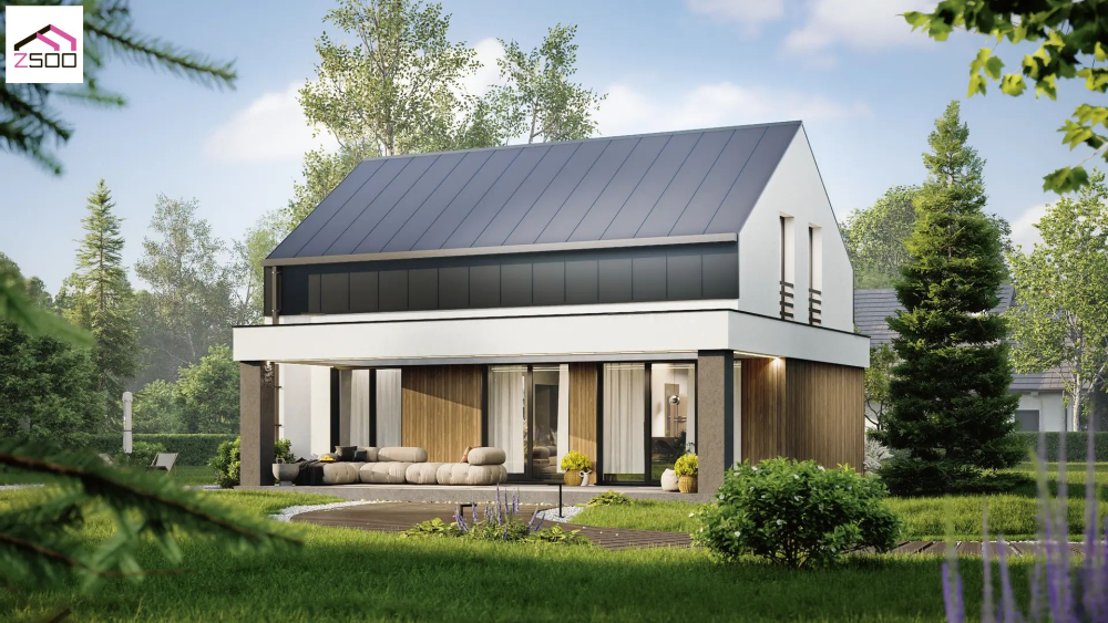 Проект затишного будинку до 150 м² з мансардою, біокаміном і терасою-патіо