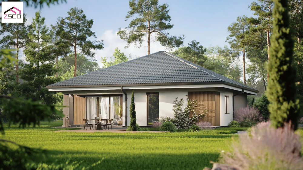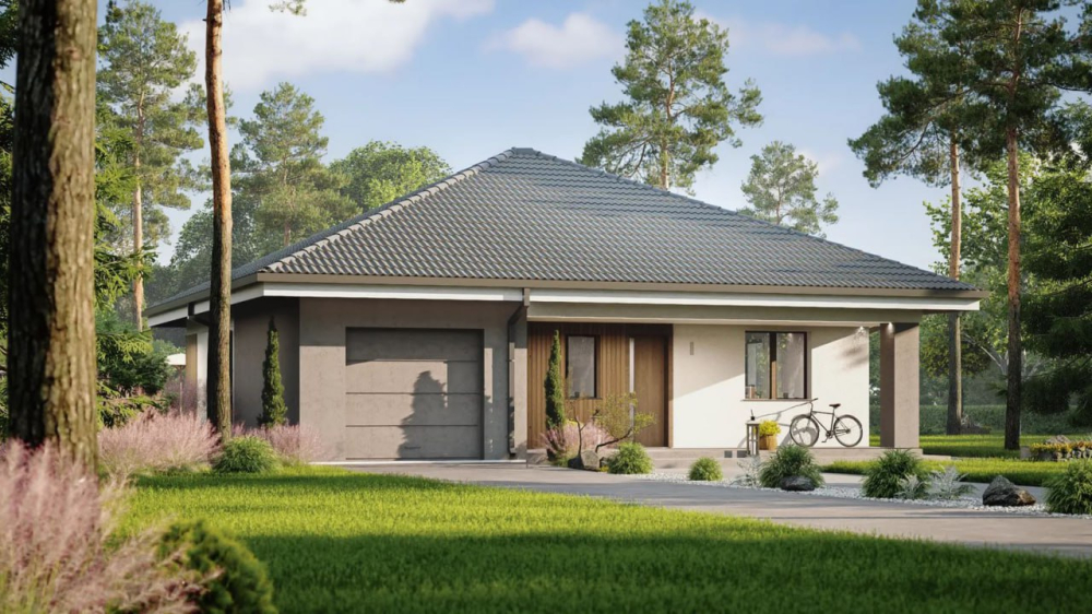 Мінімалістичний одноповерховий будинок з гаражем і терасою для літніх вечерь