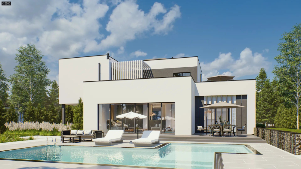 Сучасний двоповерховий будинок у стилі мінімалізму з чіткою геометрією форм і контрастним поєднанням світлого та темно-сірого кольорів фасаду. Акцентом є панорамні вікна, що забезпечують максимальне природне освітлення та візуальний зв’язок із природою. На другому поверсі — тераса з декоративними вертикальними ламелями. Вхідна зона оформлена навісом і сучасним гаражем, інтегрованим у корпус будинку. Архітектура вирізняється лаконічністю, функціональністю та елегантністю ліній.
