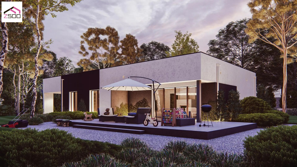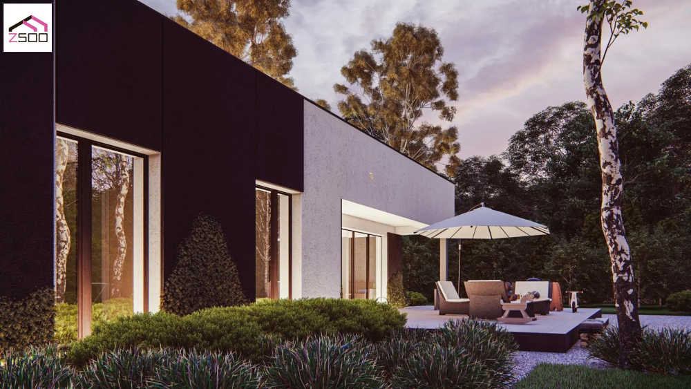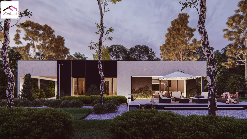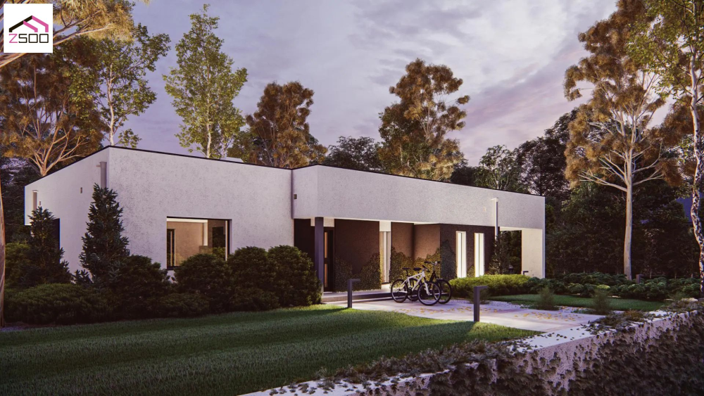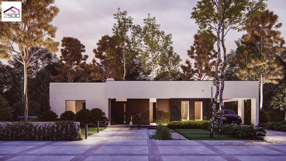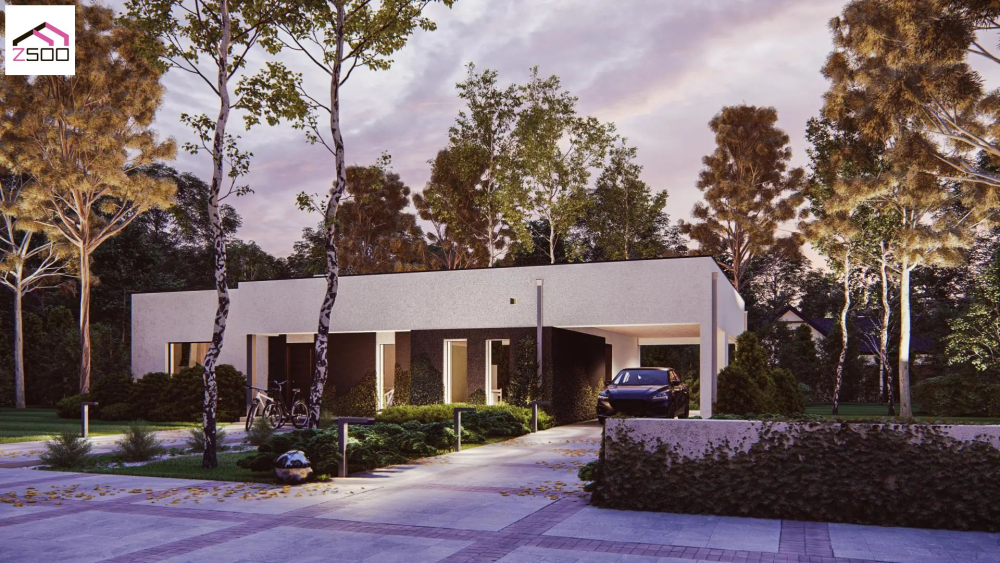 Проєкт функціонального будинку з навісом на два автомобілі та терасою.